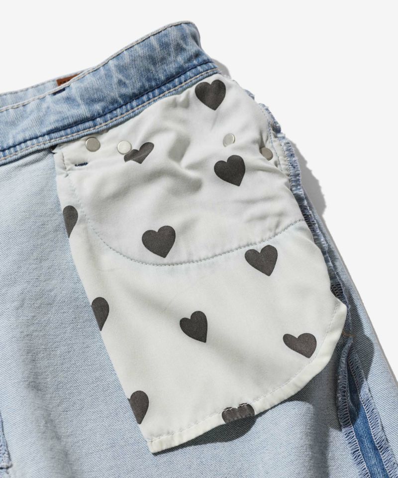 スレキにも、女性心くすぐる♥プリントを採用。見えない細部までこだわり尽くした1本です。腰帯刺繍には、樋口さんがYANUKジーンズのネーム付けがかわいいと気にいってくださり、閂止ディテールを蛍光ピンクでおしゃれにデザイン。糸を垂らしているのもデザインポイントです。