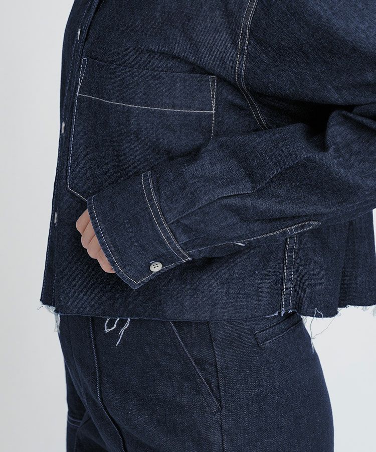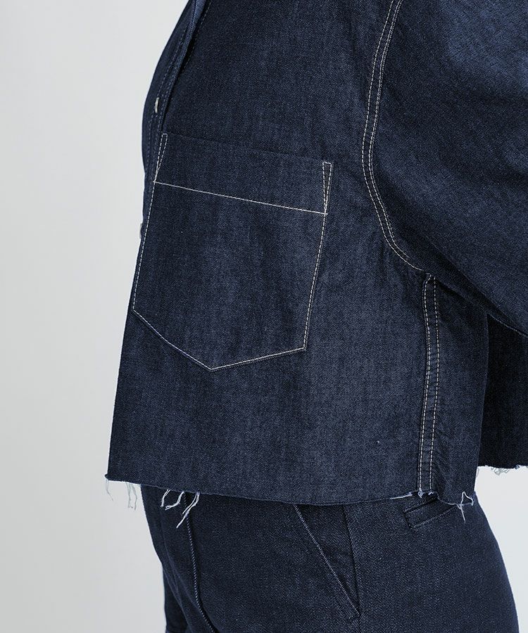 「リジット風の濃色が続く」かつ「柔らかい」を両立させた生地。たて糸が反応染めなので、色落ちしにくくなっています。生地は薄く軽く、柔らかさのあるしなやかな風合いです。色落ちしにくい生地ではありますが、濃色のためお洗濯の際は単独洗いをお願いします。