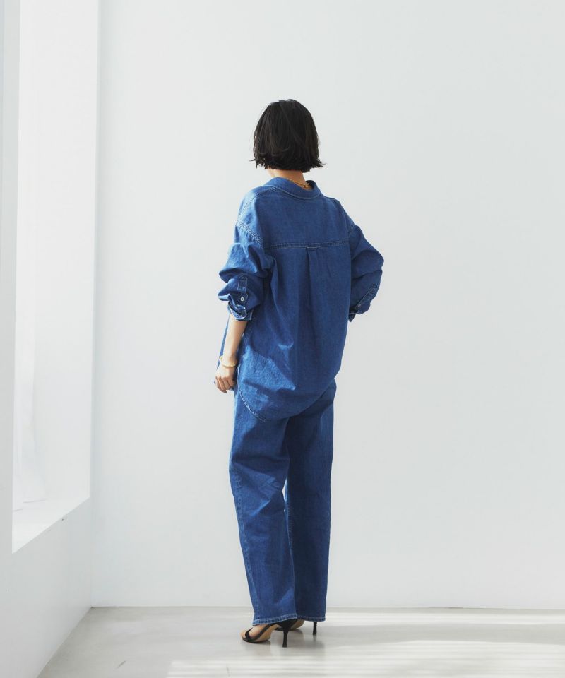 程よいあたり感とスリヒゲが落ち着いた印象のブルー色です。モモが内側寄りに入っているので、脚がスッキリして見えます。股上が深めだとお腹回りの間延び感が気になりますが、ヒゲやスリが入っているので立体感があり、気になるお腹回りをカバーしてくれます。ナノミスト加工という、従来のデニム加工よりも水の使用料を削減でき、環境にも優しい加工を施しています。通年で使いやすい定番色なので、デニム初心者さんにもおすすめです。