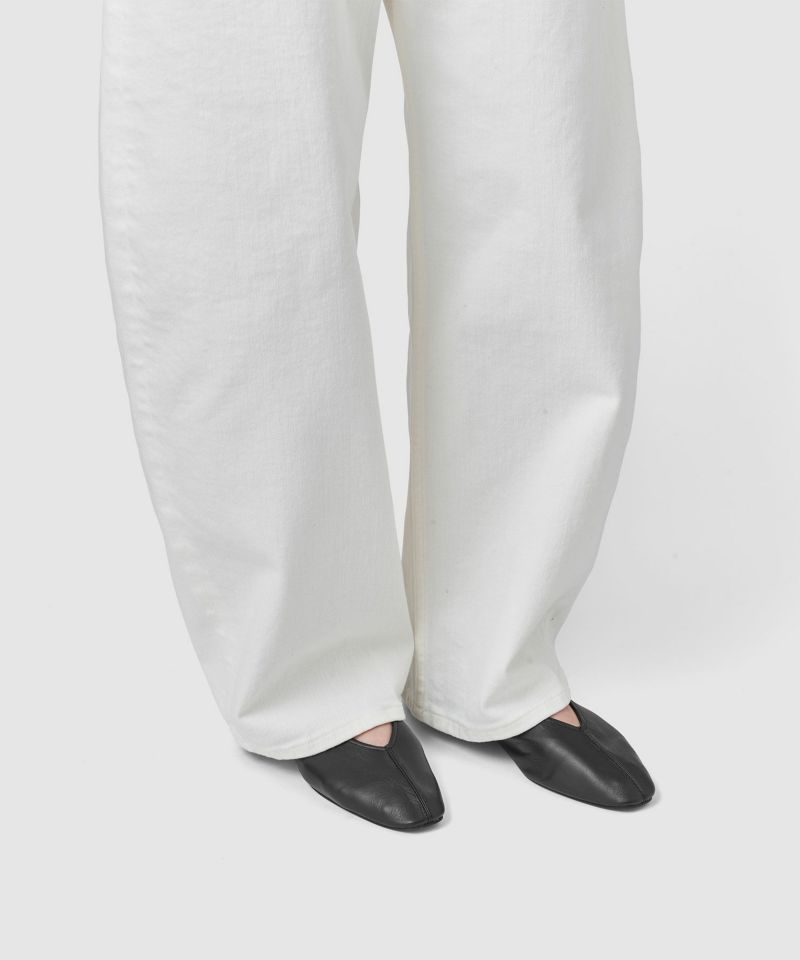 裾に向けて大きくカーブした作りのカーブテーパードです。レッグラインは脇のカーブと裾のダーツで立体的に膨らむように計算され、内側のラインはシャープにすっきりさせています。腰付近はすっきりとフィットして女性らしく、脇のカーブも高く持ってくることで、トレンド感をだしながら足を長くきれいに見せるシルエットとなっています。シンプルな装いにもこなれた着こなしに見せてくれます。裾は三巻仕上げとなっています。