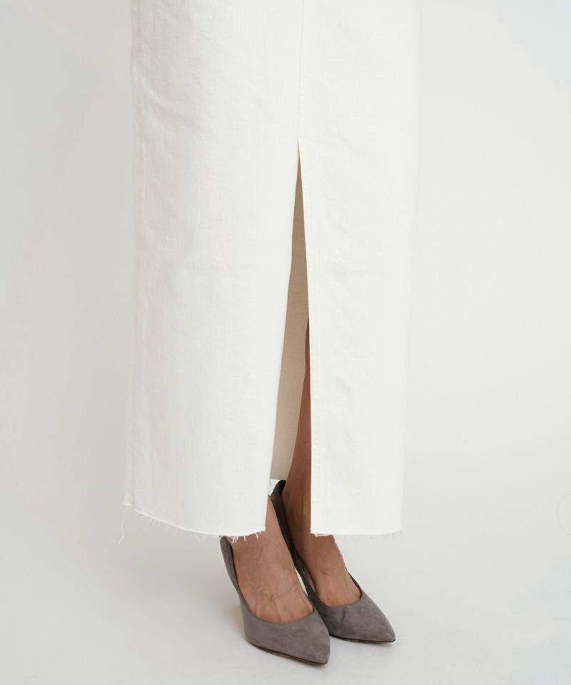 Iラインシルエットのロングスカート。腰回りがフィットしていて、裾に向かって真っすぐ落ちるすっきりとしたシルエットです。前スリットがポイントで、抜け感を演出しつつ足さばきしやすく、大人な印象を与えてくれます。腰回りがスッキリとしていて丈が長めなので縦のラインを強調し、脚長効果が期待できます。クロップド丈のトップスとも相性がよく、バランスよく合わせられます。ウエストの位置をミドルウエストで合わせてもらうとこなれ感がでて、今っぽく穿いていただけます。