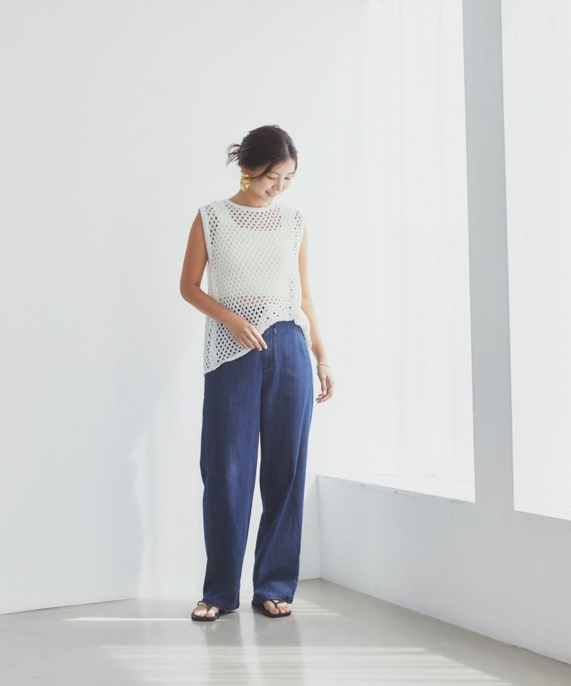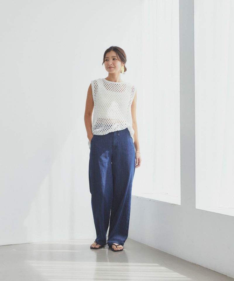 毎シーズン大好評のリラックスパンツシリーズです。ワイドめなストレートシルエット。絶妙な裾巾の広さで、すっきりとしています。程よくゆるいストレートなので穿きやすく、長すぎず短すぎない丈で、フラットシューズやスニーカーとも相性がいいです。ウエストは柔らかめのゴムを使用しているので窮屈感なく穿き心地も抜群です。ウエストのドロストでサイズ調節が可能。ドロストが気になる場合には、ベルトの内側に紐を隠す事もできます。今季らしく穿くポイントはジャストウエストではなく、腰を少し落としてゆるく穿くと◎。ウエストがゴムなので、好みの位置で穿ける万能アイテムです。