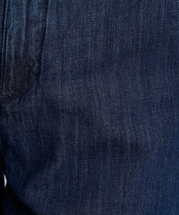 素材特有のムラ感とシボ感を活かした濃い目のインディゴ色です。全体に洗い込んだ加工感が特徴で、麻の節と相まって立体感があり、程よいカジュアルさと落ち着いた色目がポイントです。