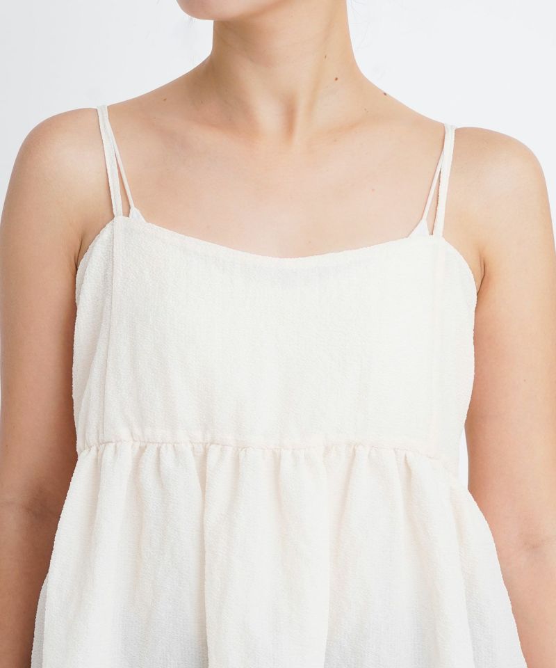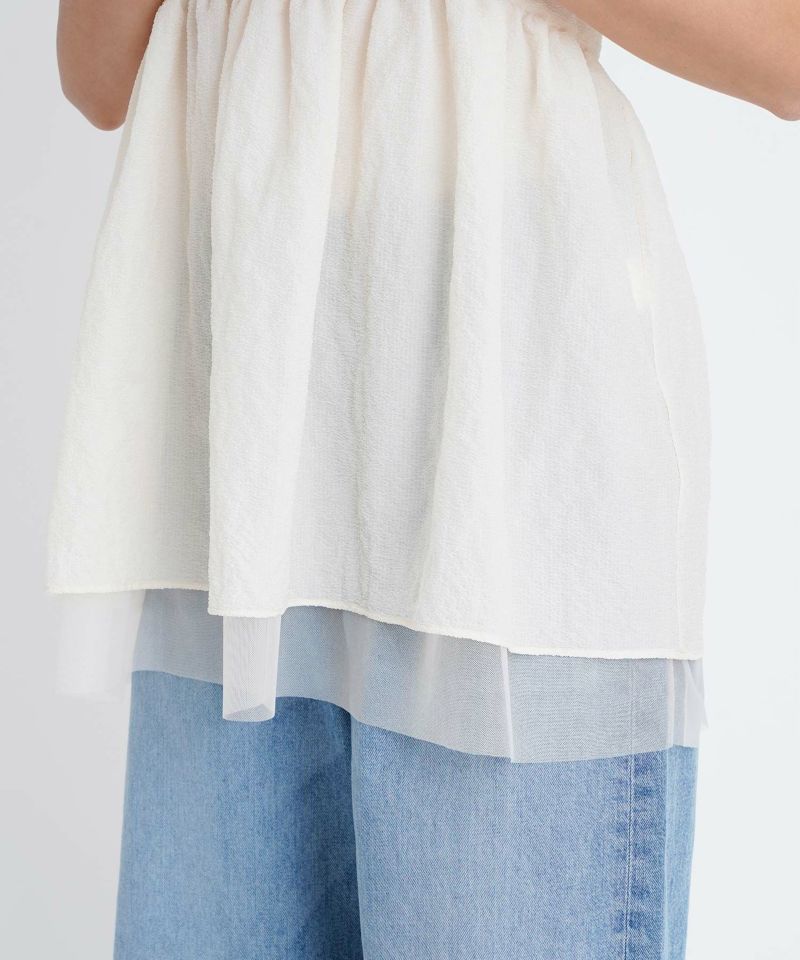 ジーンズスタイルにほどよい甘さをプラスしてくれるシアーキャミソール。生地の表面感・シアー感を活かし、ディテールは甘くしすぎないミニマルな印象に。大人が着やすいこなれ感ある甘さに仕上がっています。丈感にもこだわり、長めの設定にすることで、ヒップ・腰周りもカバーできる優れものです。内側に忍ばせたチュールを、あえて身生地よりも長めにすることで、ちらっと覗くチュールの裾がコーディネートにアクセントを加えてくれます。シンプルなTシャツやインナー合わせにも映えるように、バックスタイルは、少し華奢で抜け感のあるデザインになっています。ウエストの高い位置に切り替えを作っているので、着るだけでスタイルUPも叶う1枚です。