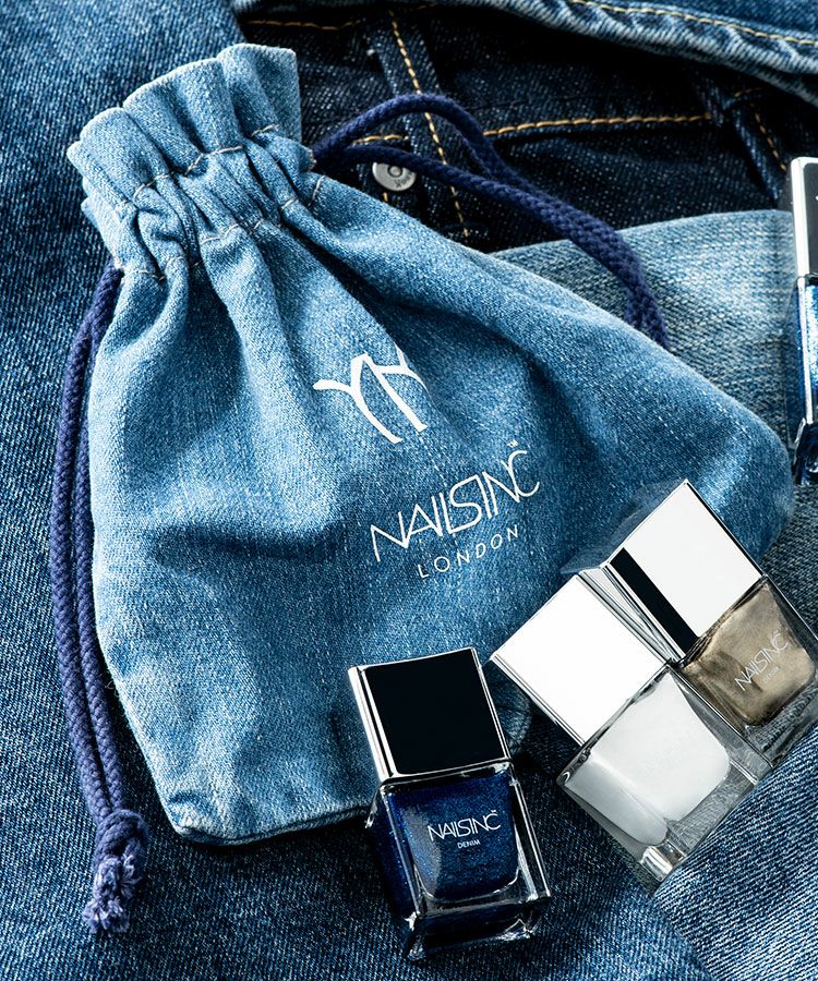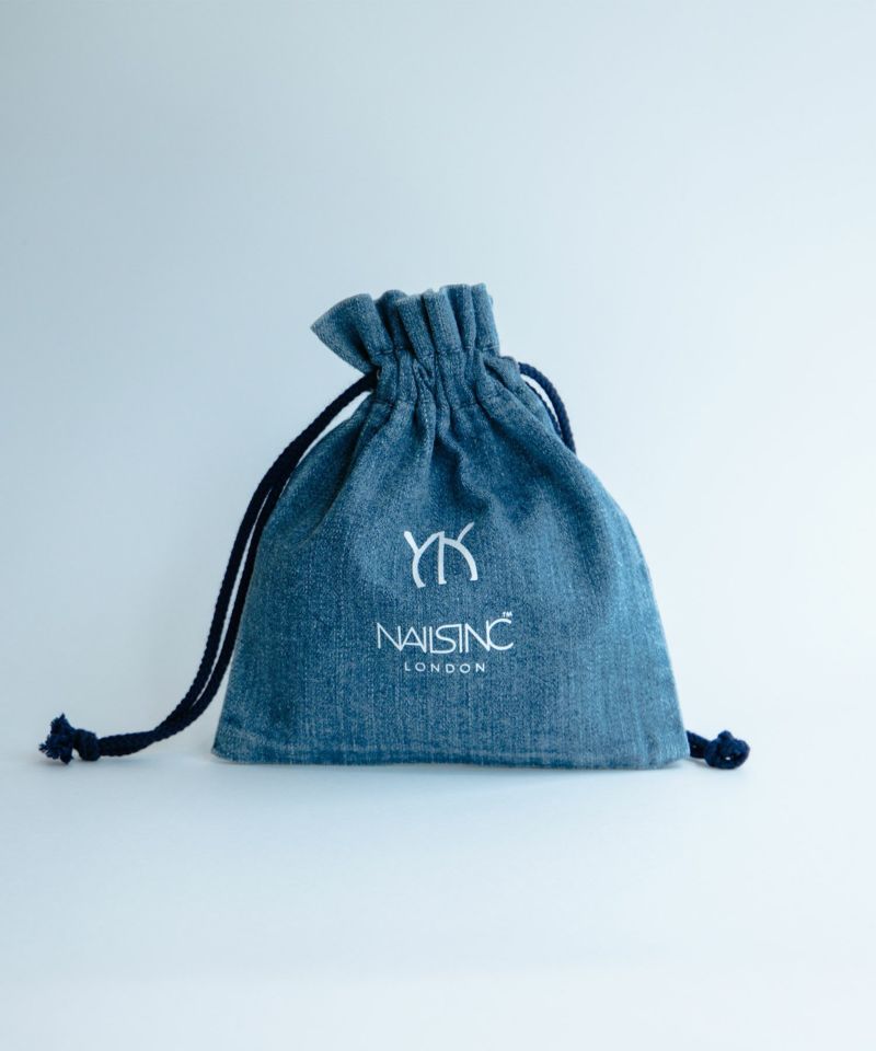 デニムには欠かせない真っ白なTシャツをイメージしたピュアホワイト、デニムのステッチの糸やボタンをイメージしジュエリーのように色めくサテンゴールド、クリーンな雰囲気のピュアなインディゴブルーのデニムエフェクトカラーの3色セットです。YANUKデニムの残布で作られたオリジナル巾着に入った、デニムの世界観をたっぷり楽しめるミニトリオキットです。