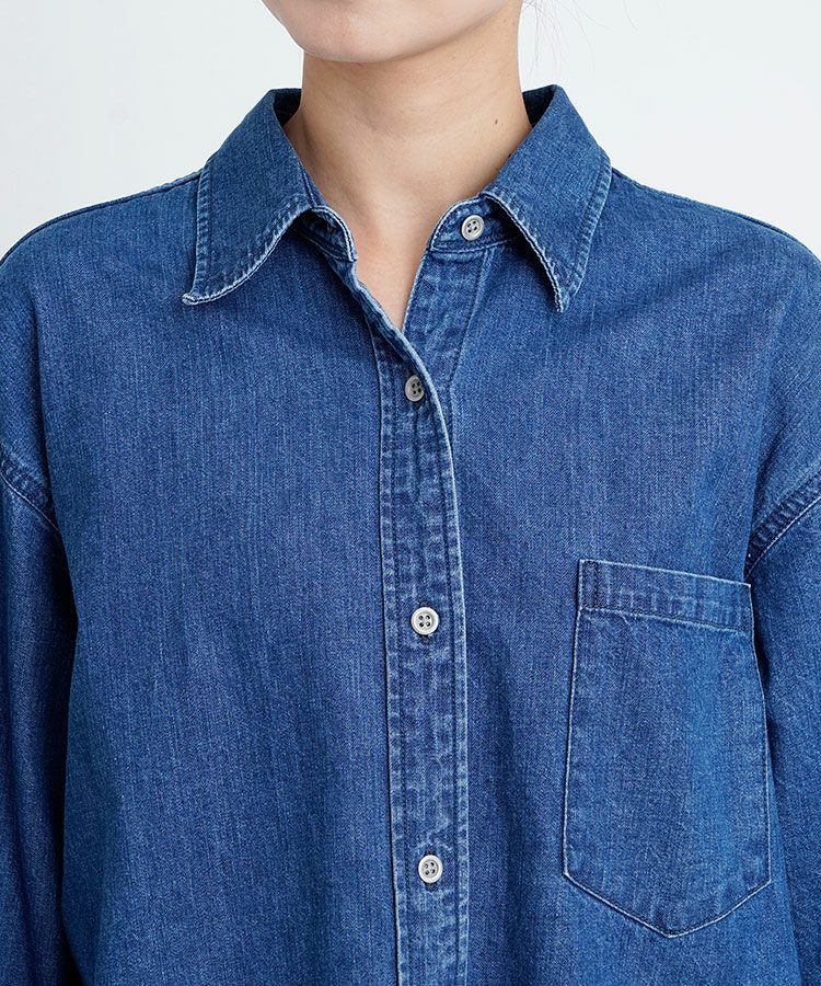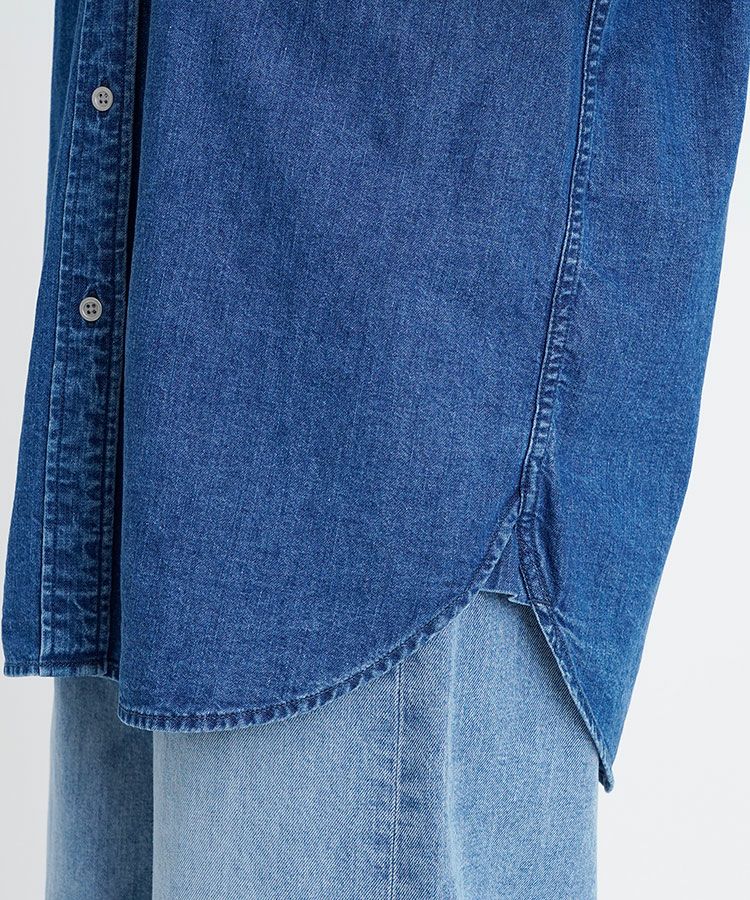 タテ糸は弱スラブ形状の糸を使用し、ナチュラルな表情が特徴です。ヨコ糸よりタテ糸が太いので綾目がしっかりと立ち、ライトオンスですが、本格的なデニムの表情です。ヨコ糸が細いので見た目よりも手持ち感が軽く感じられます。アウターとして端境期も活躍するデニムシャツ。程よい生地の薄さで、オールシーズンで着用できるため、春や秋には軽めのアウターとして、夏にはTシャツの上に羽織るなど、季節を問わずお使いいただけます。