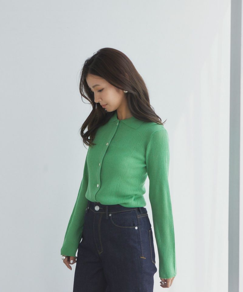 衿付のリブカーディガンです。細身のシルエットで、体にフィットし女性らしい印象です。ヒップまでかかるちょうど良い丈感で、おすすめの着方は裾側のボタンを何個かはずしてデニムを見せるように着るとこなれた着こなしになります。春先のちょっと肌寒い時期や冷房対策にも一役かってくれるアイテムです。