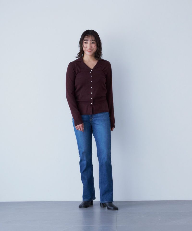 ハイウエストのセミフレア。フレア感が抑えられており、ストレートに近いブーツカットなので、ブーツカット初心者の方でも穿きやすいシルエットです。膝位置を高く設定することで、高い膝位置から自然に広がるフレアが、脚を長く見せてくれます。
