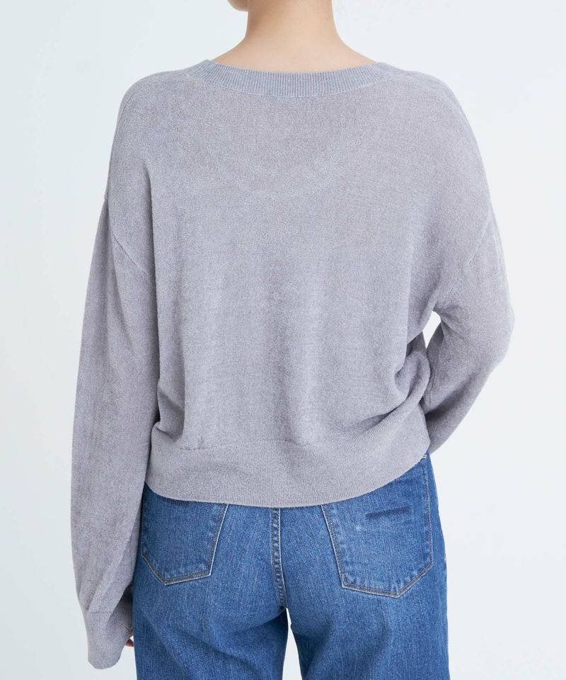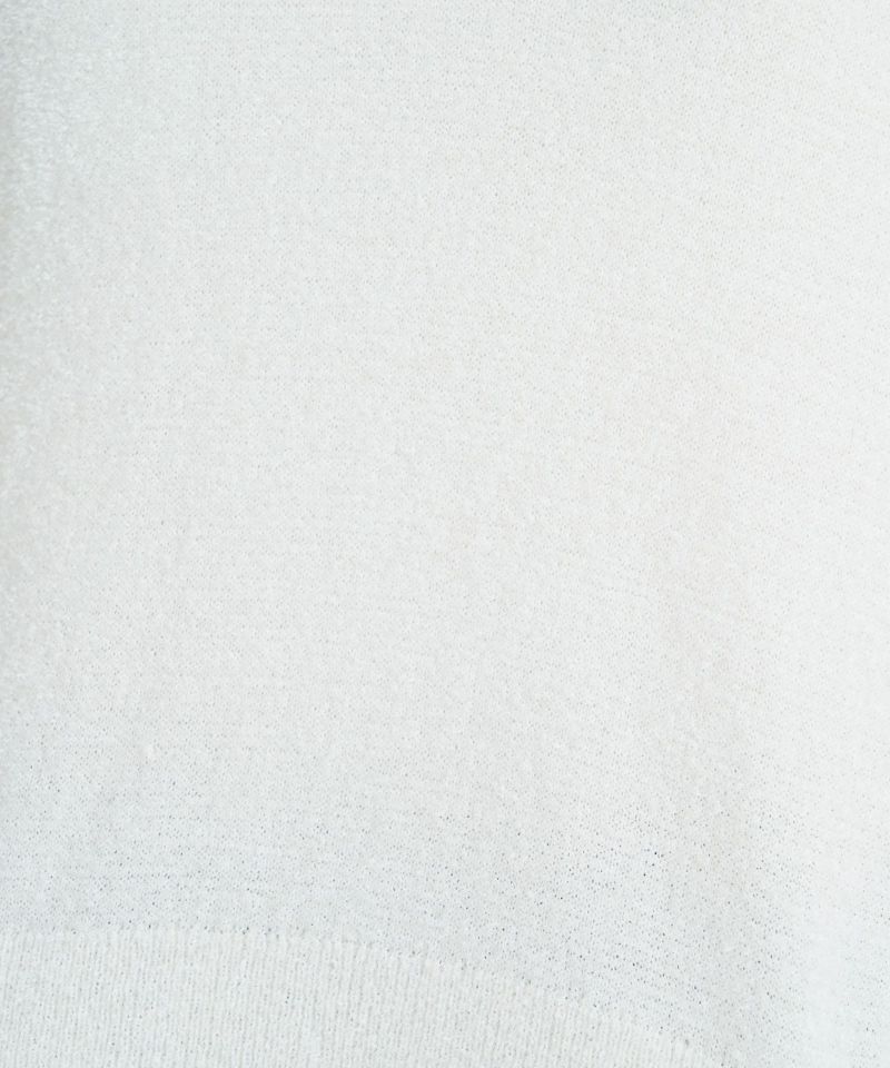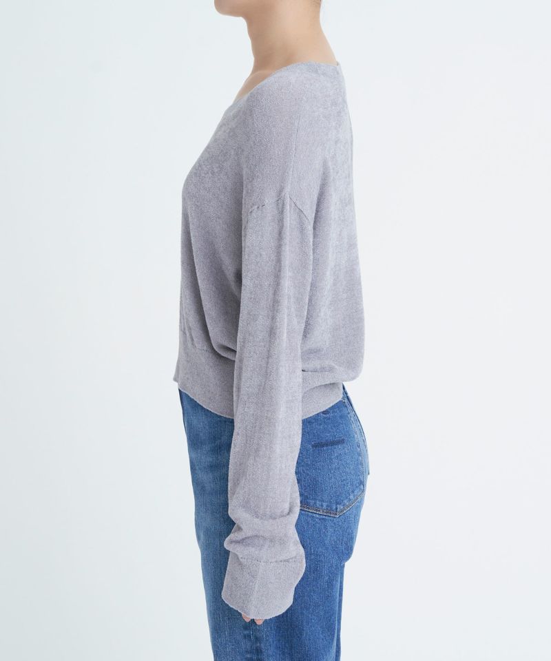 レーヨンとナイロンをブレンドしたモール糸を使用し、なめらかな落ち感と程よいハリを両立。羽のような繊維が絡み合った独特の表情が、見た目にもやさしい印象を与えます。12ゲージの天竺編みによって、上品で軽やかな仕上がりに。厚すぎず薄すぎない程よい肉感で、長い期間着ていただけます。
