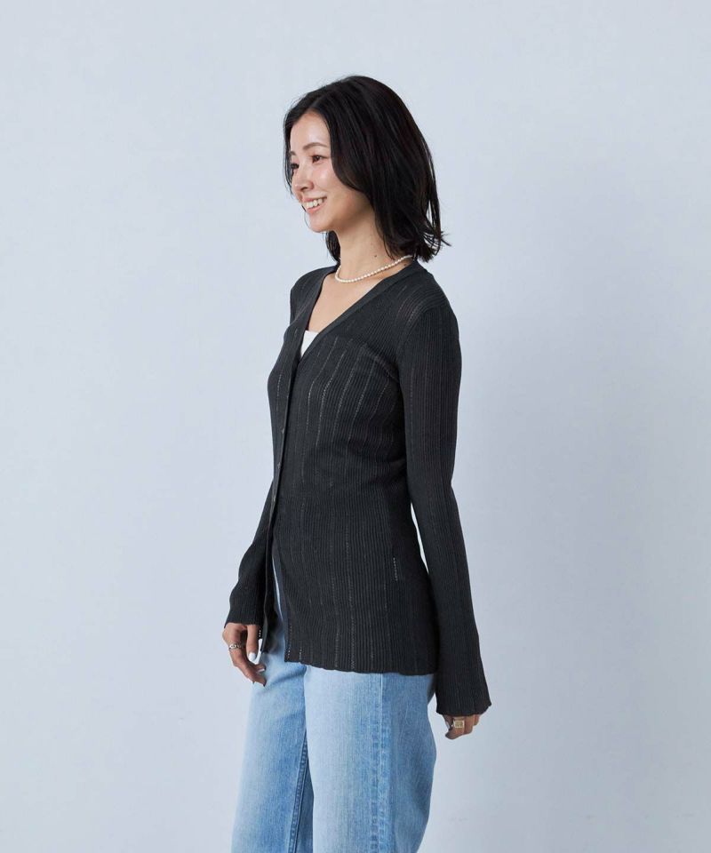 程よいフィット感が女性らしいVネックのニットカーディガンです。中心の細かなボタンディティールがポイントで、一枚着としてラフに着るだけでもすっきりとこなれた印象に。身体のラインを拾いすぎないシャリっとした糸ですが、安心感のあるやわらかい着心地も嬉しいポイント。シンプルなデザインでデイリーユースに活躍する万能アイテムです。
