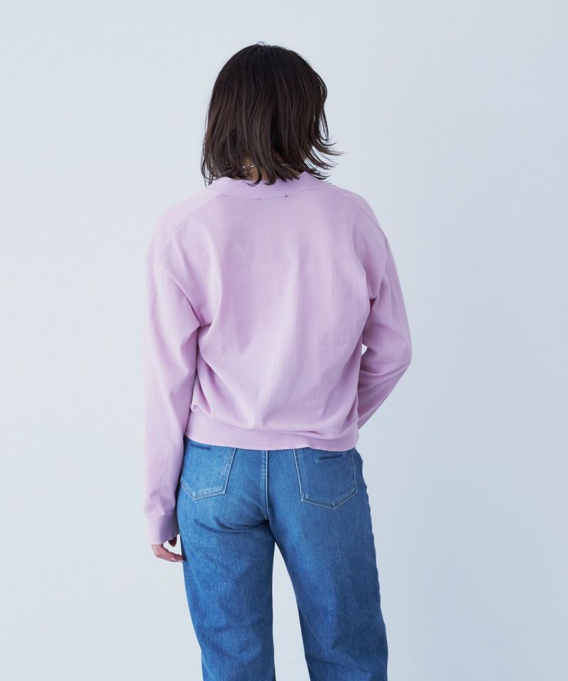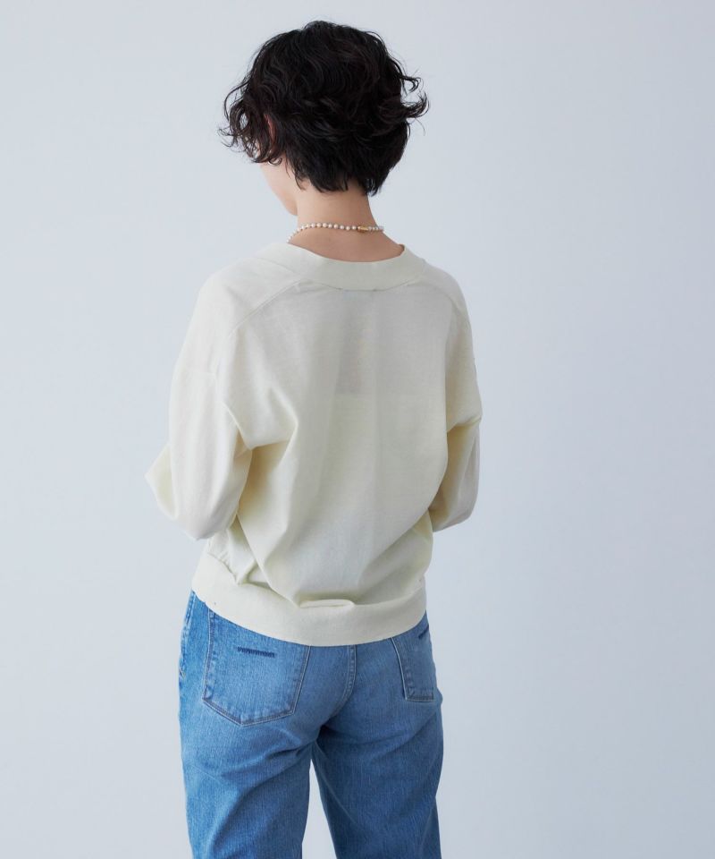 上品な表情と軽やかな着心地を兼ね備えた編み地を採用。綿85%・ナイロン15%の糸を使用し、肌なじみの良い柔らかさと、型崩れしにくい適度なハリ感を両立。16ゲージの繊細な編み地を、あえて裏目に仕立てることで、表面に自然な凹凸感が生まれ、シンプルながらも奥行きのある表情に仕上げました。