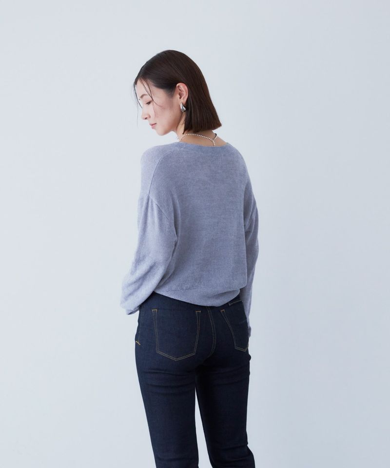レーヨンとナイロンをブレンドしたモール糸を使用し、なめらかな落ち感と程よいハリを両立。羽のような繊維が絡み合った独特の表情が、見た目にもやさしい印象を与えます。12ゲージの天竺編みによって、上品で軽やかな仕上がりに。厚すぎず薄すぎない程よい肉感で、長い期間着ていただけます。
