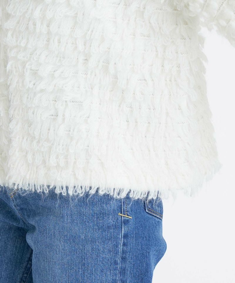ループ編みを全体に入れた、ボリューミーな編地です。モヘヤ糸をループ部分に使用することにより、エアリーで軽い印象に仕上げています。