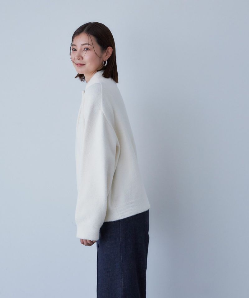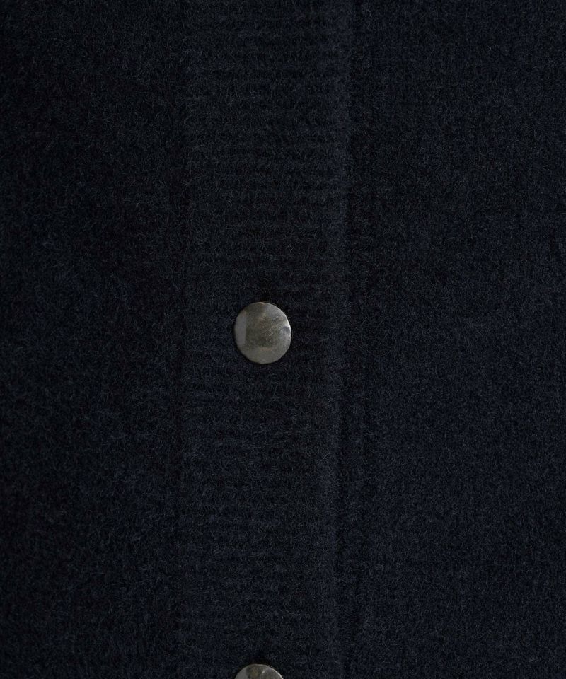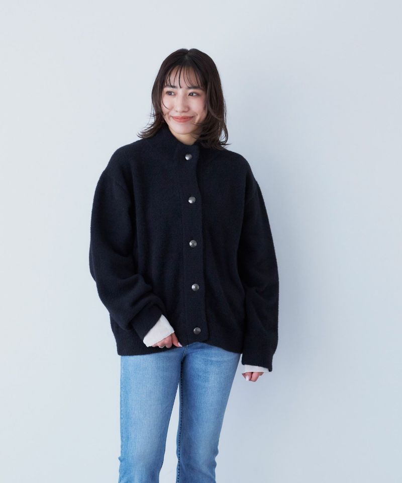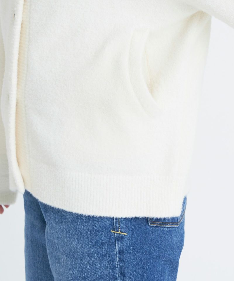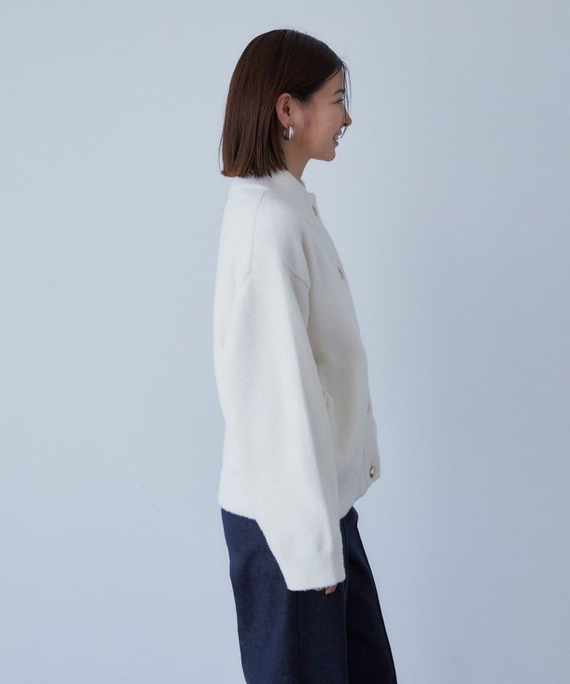 ふんわりとした表情でかつしっかりした肉厚のニットで、カーディガンのようにもアウターのようにも着まわせるアイテムです。丸みをおびたようなフォルムで、中にも着重ねやすいようなゆったりしたシルエットになっています。表情がふんわりしていますが、金属のボタンが全体の印象を引き締めます。脇にはポケットも付いているのでアウターとして着るときにも重宝します。肌寒くなってきた日に丁度いいですし、真冬にもコートの中に着用できる着回しのいいニットカーディガンです。