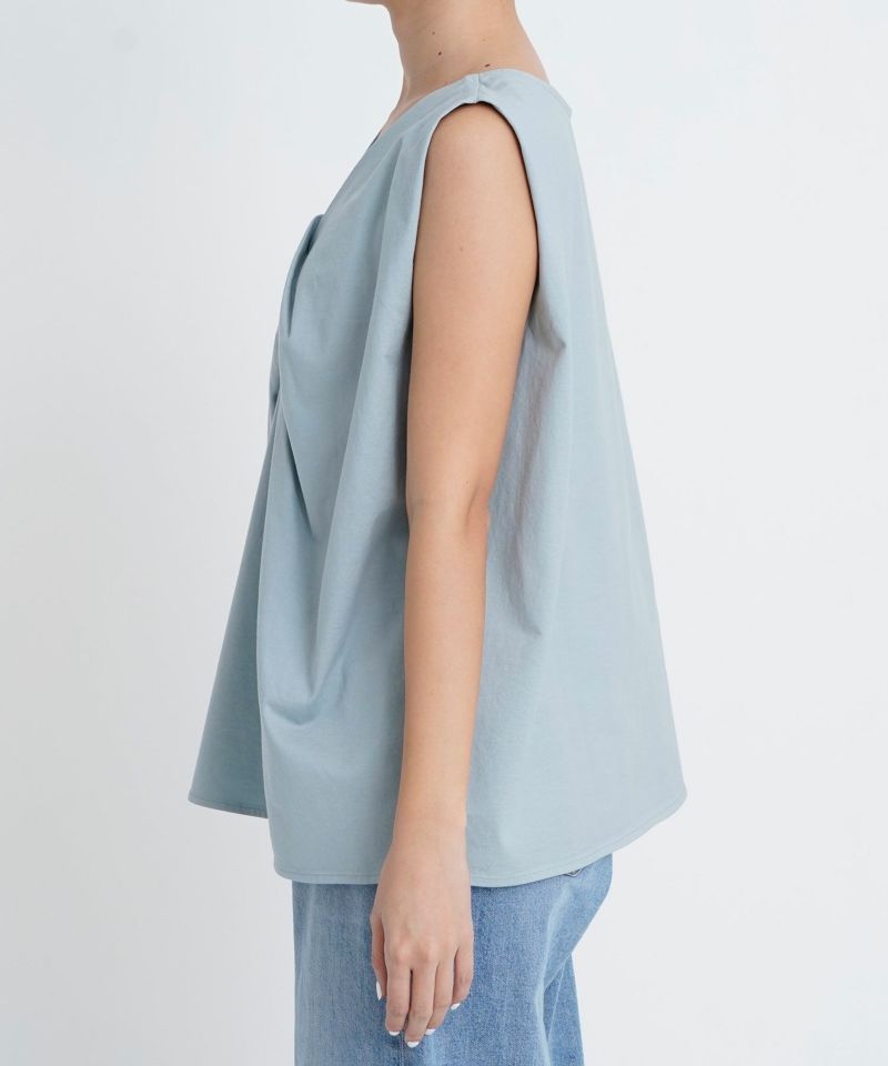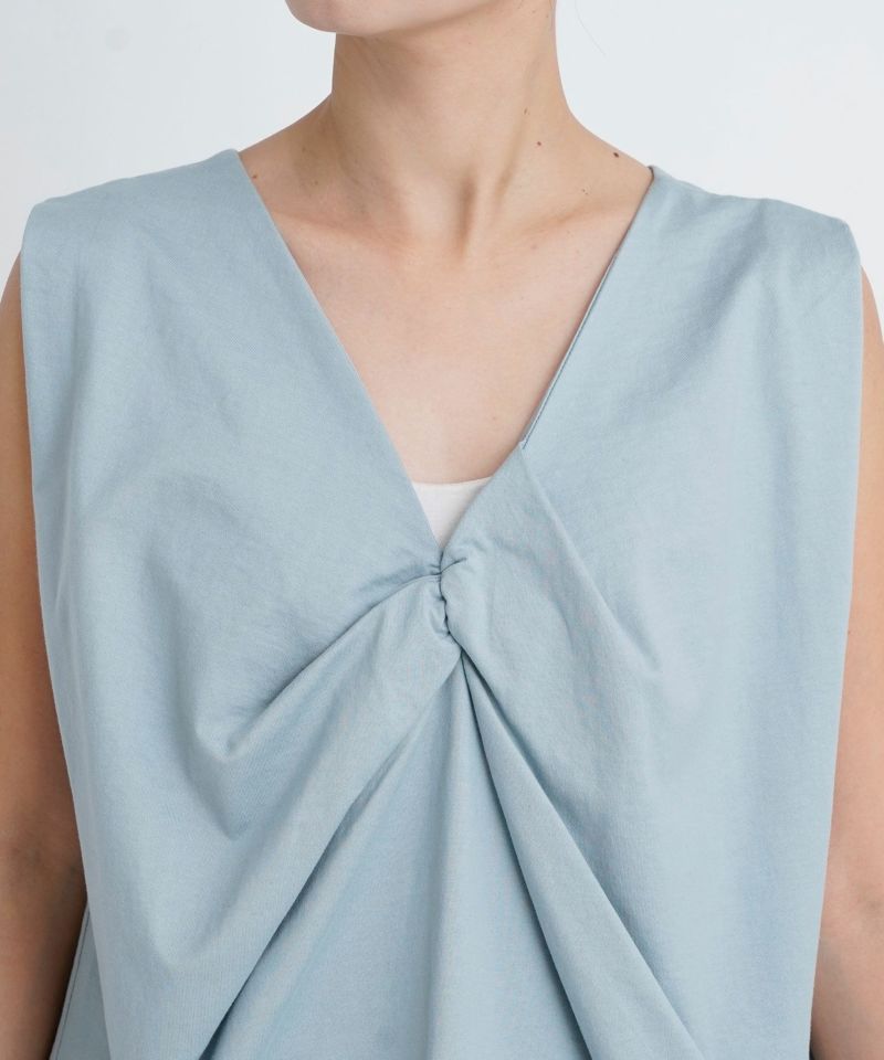 ねじれのアクセントデザインがポイントのノースリーブです。ねじれていることでふんわりとした着用感が生まれ、一枚でサマになるトップスになっています。前後着用することができ、前にねじれをもってきてもいいですし、バックスタイルにアクセントをいれてもかわいいデザインです。体にフィットし過ぎないフォルムで着用しやすいノースリーブです。