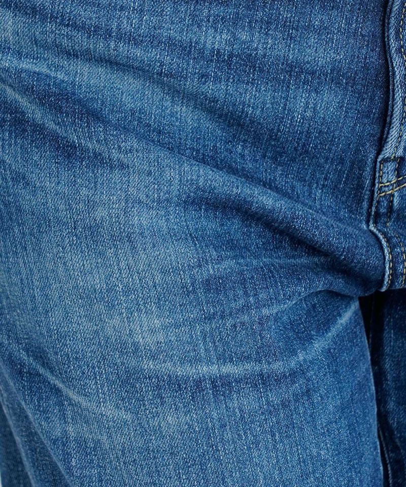 ヴィンテージ好きが好む「濃色の穿き込まれたジーンズ」を再現しています。このパンツの一番の特徴が、メリハリのあるヒゲです。しっかり穿き込まれないとできないヒゲを忠実に再現しています。ポイントとなる美しいヒゲを地平線に例えて「Horizon Blue」という色名をつけました。高い技術のレーザー加工で施された、全体に入ったシボやシワは、ヴィンテージデニム特有の表情を模しており、本物のヴィンテージさながらのクオリティです。本格的な外見と穿き心地のギャップに驚く1本です。