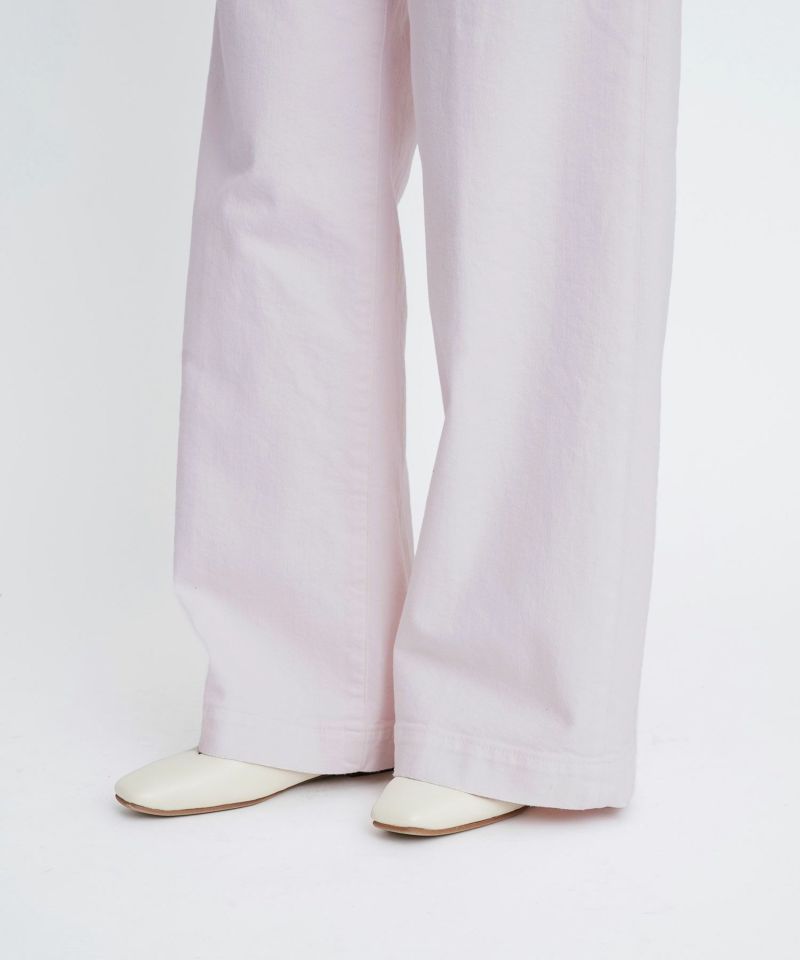 ワイドシルエットが流行しており、今回のコラボレーションでは、よりクリーンな印象で穿けるトラウザーパンツを作成。タックなどのディテールは取り入れず、できる限りディテールを簡素化することで、様々なコーディネートに馴染みやすい1本になっています。また、通勤スタイルから休日コーデまでシーンレスに活躍すること間違いなしです。前回コラボでも好評だったハートプリントスレキ/閂止刺繍を引き続き採用しています。