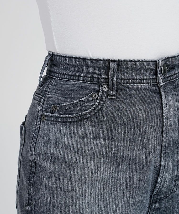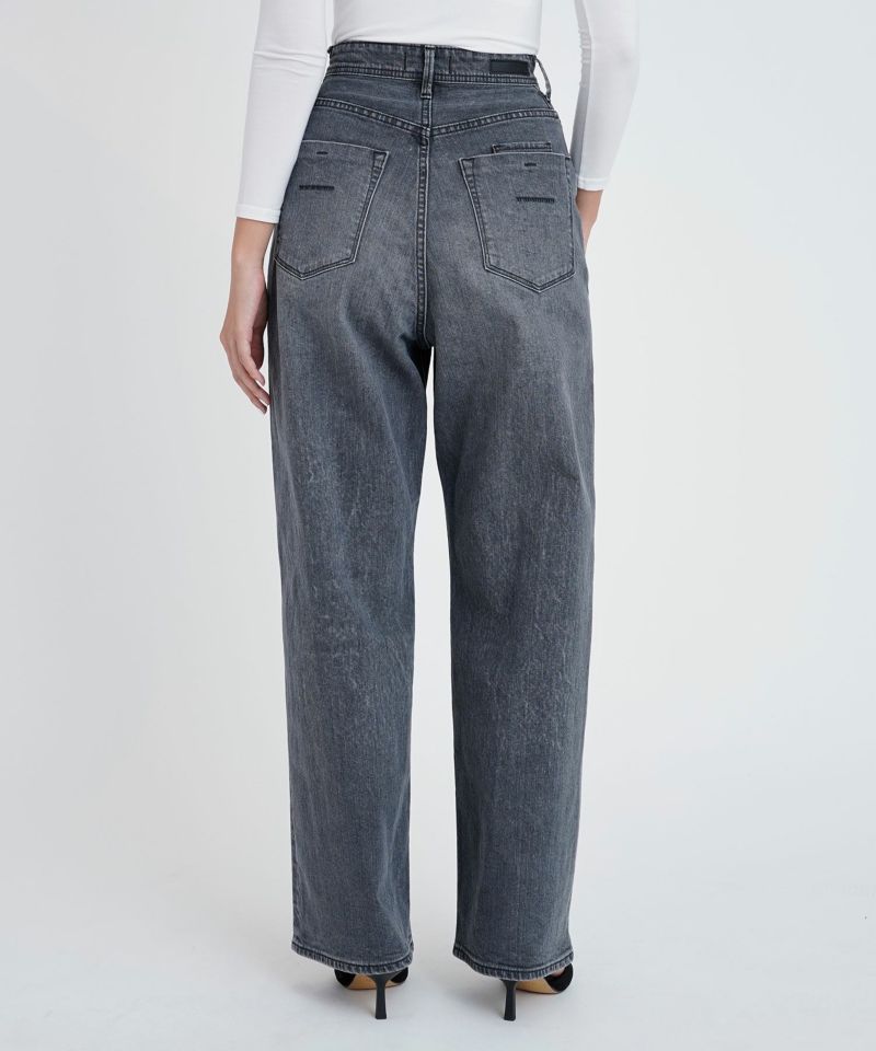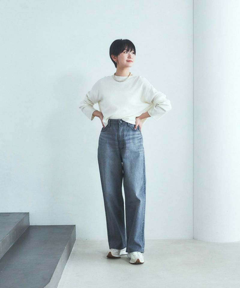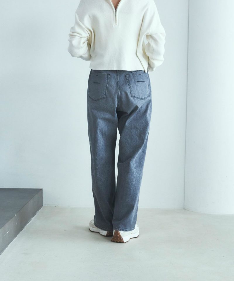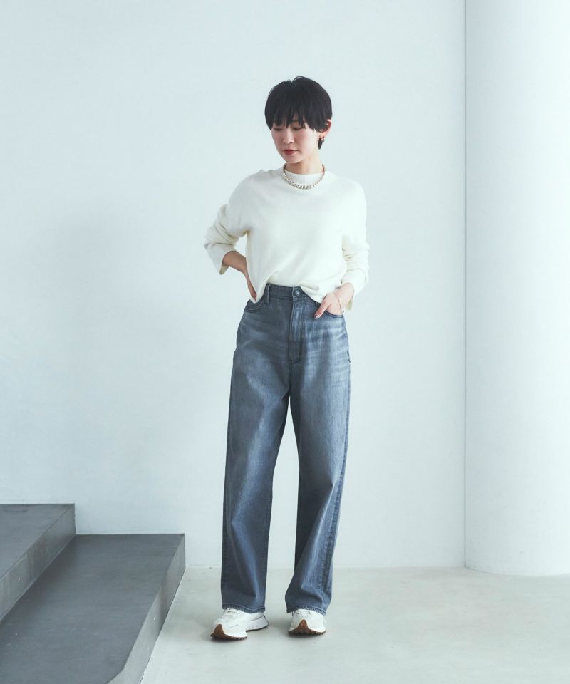 お客様からの要望が多かったJOANのグレーデニム。ボリュームのあるシルエットなので、重たい印象になりすぎないよう、色味を少し薄めのライトグレーに仕上げています。また、薄いカラーにしすぎると、夏っぽさが出すぎてしまうので、1年通して穿きやすいライトグレーにしています。スリ加工にエッジが効かせすぎないことで、USED感がありながらも上品さも兼ね備えた表情に仕上がっています。モモスリの脇にしっかりと濃く残った部分を作ることで、モモが張って見えず、脚が細く見えるようにこだわっています。いい意味で主張しすぎない為、様々なコーディネートに取り入れやすいです。