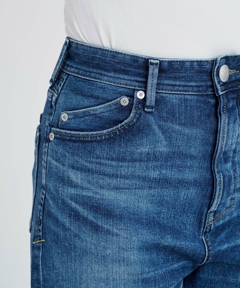 ヴィンテージ好きが好む「濃色の穿き込まれたジーンズ」を再現しています。このパンツの一番の特徴が、メリハリのあるヒゲです。しっかり穿き込まれないとできないヒゲを忠実に再現しています。ポイントとなる美しいヒゲを地平線に例えて「Horizon Blue」という色名をつけました。高い技術のレーザー加工で施された、全体に入ったシボやシワは、ヴィンテージデニム特有の表情を模しており、本物のヴィンテージさながらのクオリティです。本格的な外見と穿き心地のギャップに驚く1本です。