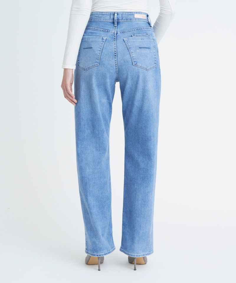 リアリーライトデニムのLEA。夏におすすめな爽やかライトブルーで、淡色ですがしっかりスリを入れることでYANUKらしいきれいめな印象です。ナノミスト加工という、従来のデニム加工よりも水の使用料を削減でき、環境にも優しい加工を施しています。