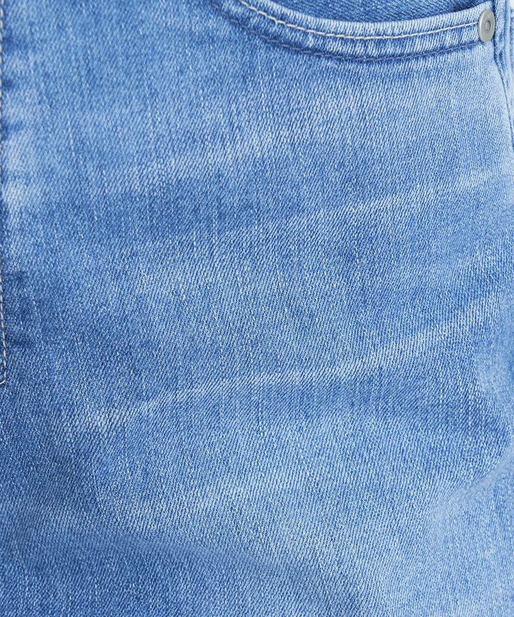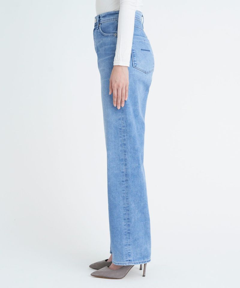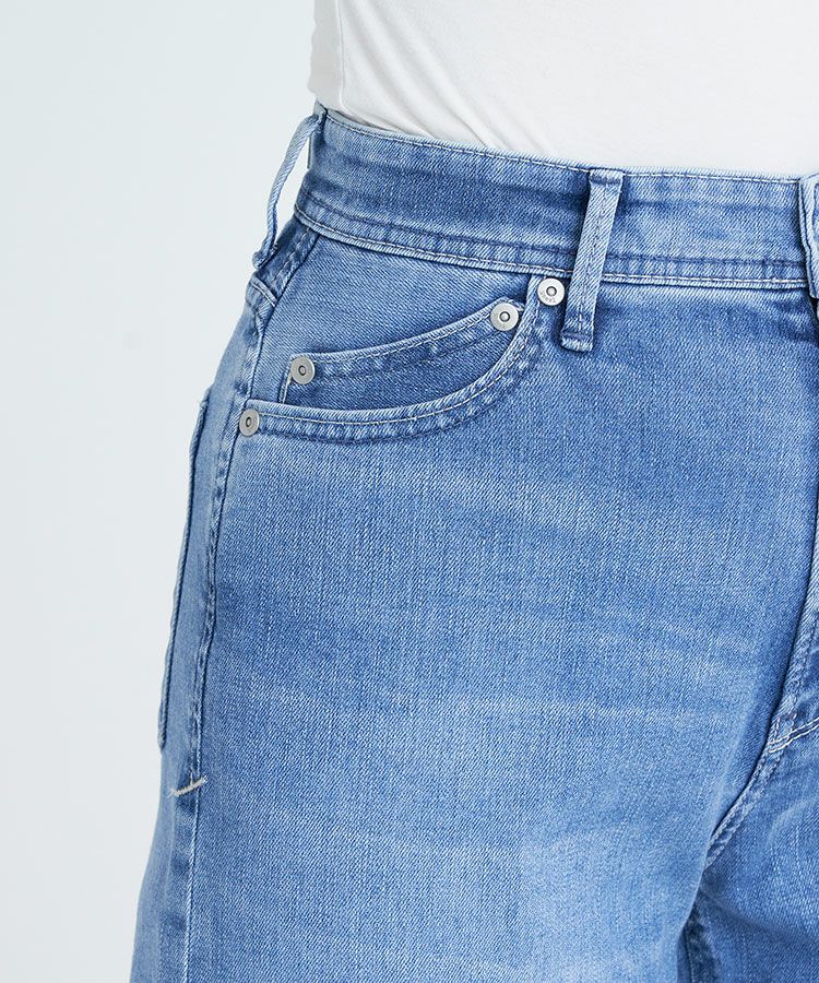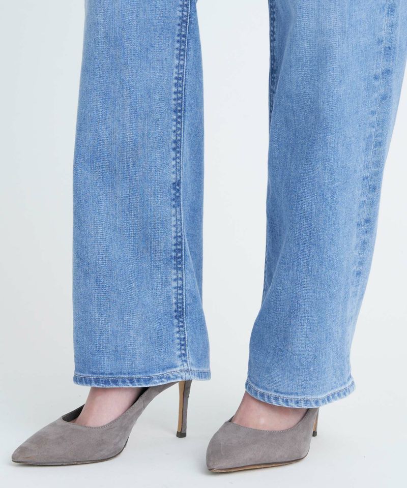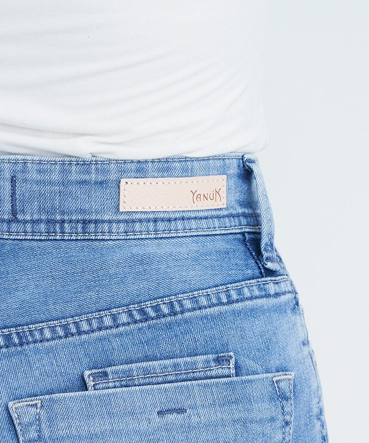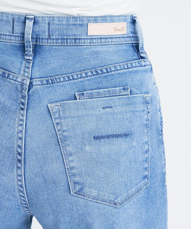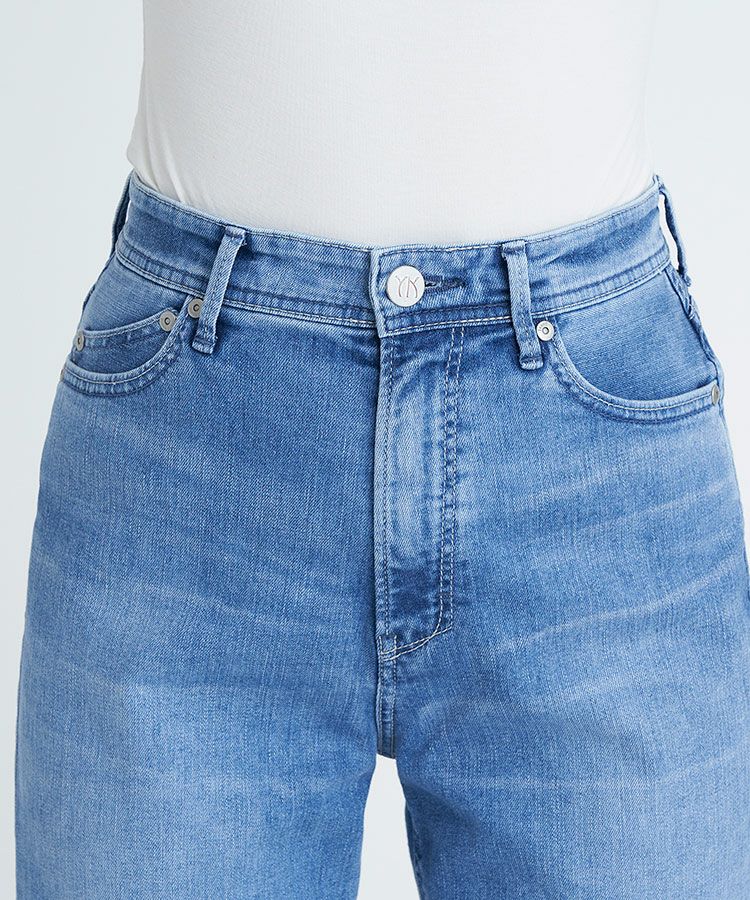 リアリーライトデニムのLEA。夏におすすめな爽やかライトブルーで、淡色ですがしっかりスリを入れることでYANUKらしいきれいめな印象です。ナノミスト加工という、従来のデニム加工よりも水の使用料を削減でき、環境にも優しい加工を施しています。