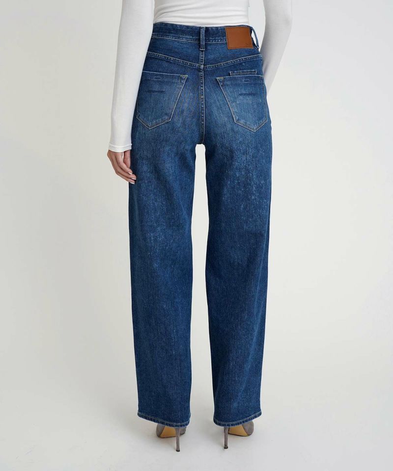 全体的にあたりのついたカジュアルなブルー色です。ヒゲをしっかり入れ、腰回りの間延び感を軽減。脚がきれいに見えるように前モモのハイライトが効いています。本格的な表情にするため、レーザー加工でシボ風のあたりをつけています。あたりがつきカジュアルな印象ですが、脚がきれいに見えるポイントをしっかりおさえているため、きれいめコーデとも相性がいいです。穿きやすさと本格的な加工のギャップに驚く1本です。