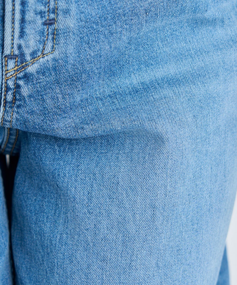 濃淡のコントラストが強い加工ではなく、洗いをかけてあえてぼんやりとした古着顔に仕上げることで、長年穿きこんだような愛着が湧いてくる表情となっております
