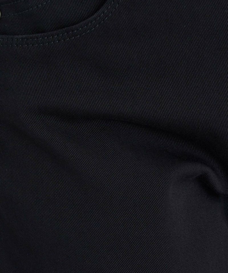 コーマコンパクト糸(コームでとかして細かい毛羽を取去り、さらに繊維の端が内側に入り込むように紡績された糸)を使用している為、毛羽立ちしにくく光沢感があります。また、ハリのある生地のため脚の肉感を拾いにくいのに、とても柔らかな履き心地です。高級感のある深いブラックを表現するために、生地に液アン加工(繊維を膨潤化させてツヤを出し、染着性を良くする加工)を施しています。さらに、「フルブラック」という深い黒に染まる染料を用いることで、しっかりと濃く染まっています。