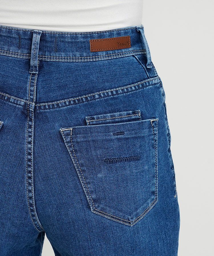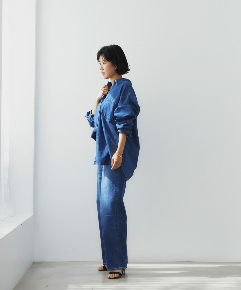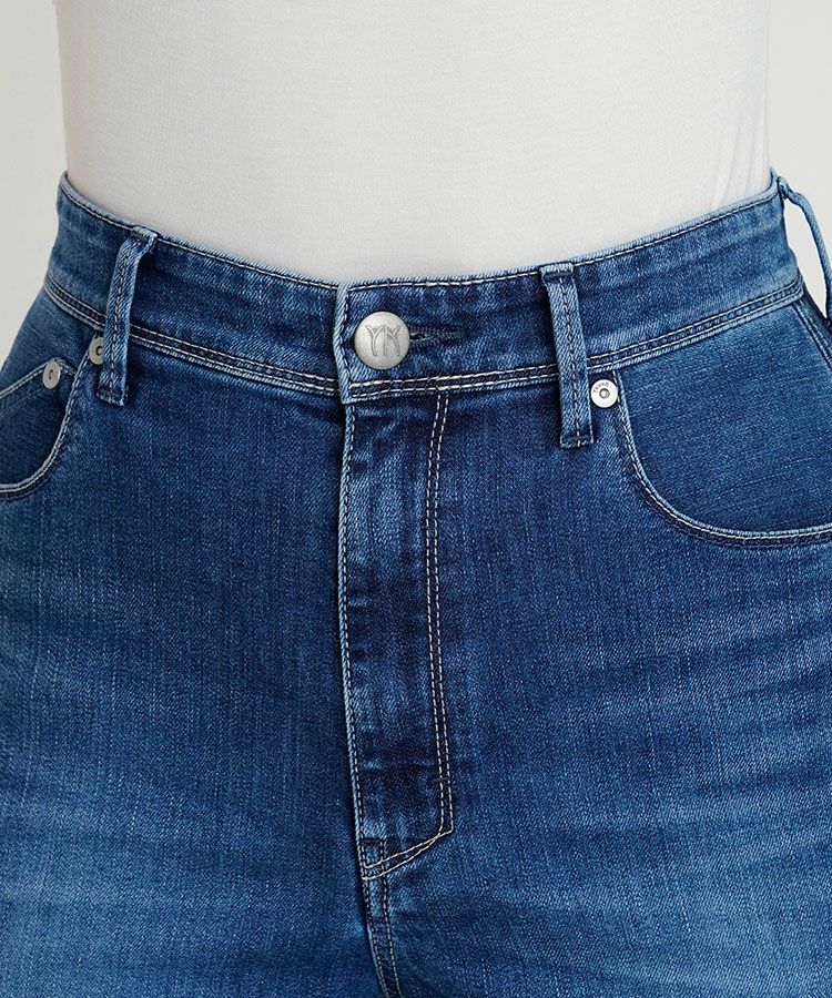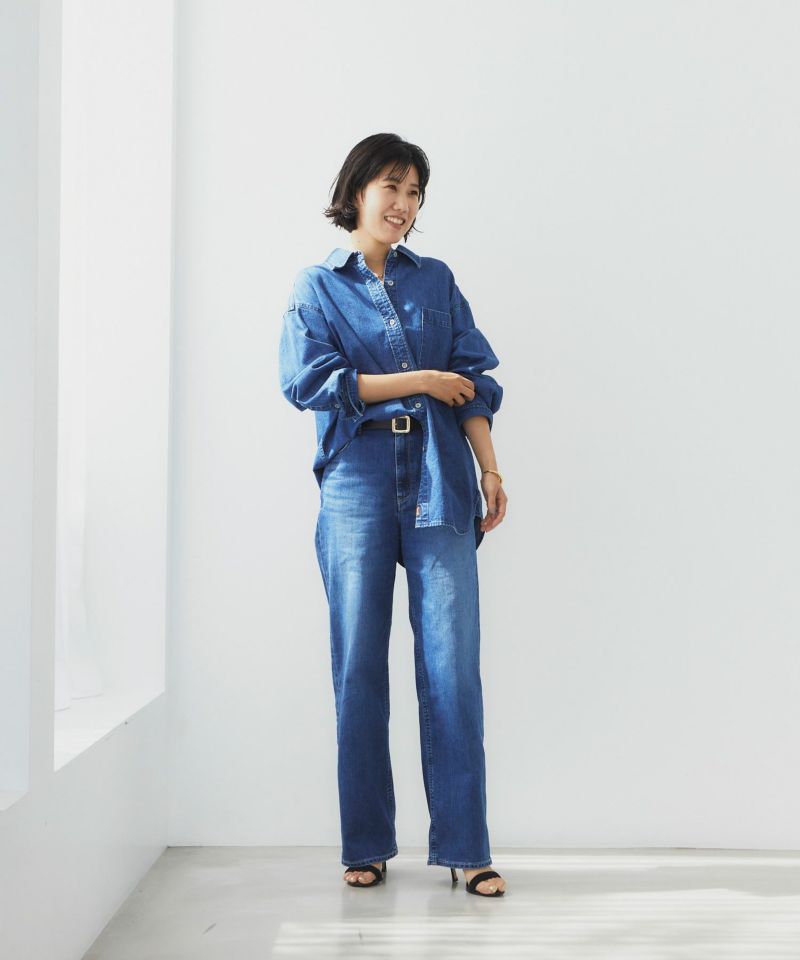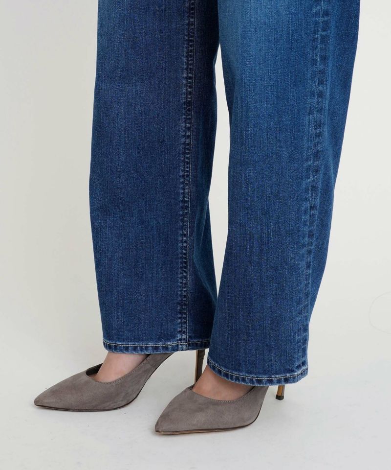 程よいあたり感とスリヒゲが落ち着いた印象のブルー色です。モモが内側寄りに入っているので、脚がスッキリして見えます。股上が深めだとお腹回りの間延び感が気になりますが、ヒゲやスリが入っているので立体感があり、気になるお腹回りをカバーしてくれます。ナノミスト加工という、従来のデニム加工よりも水の使用料を削減でき、環境にも優しい加工を施しています。通年で使いやすい定番色なので、デニム初心者さんにもおすすめです。