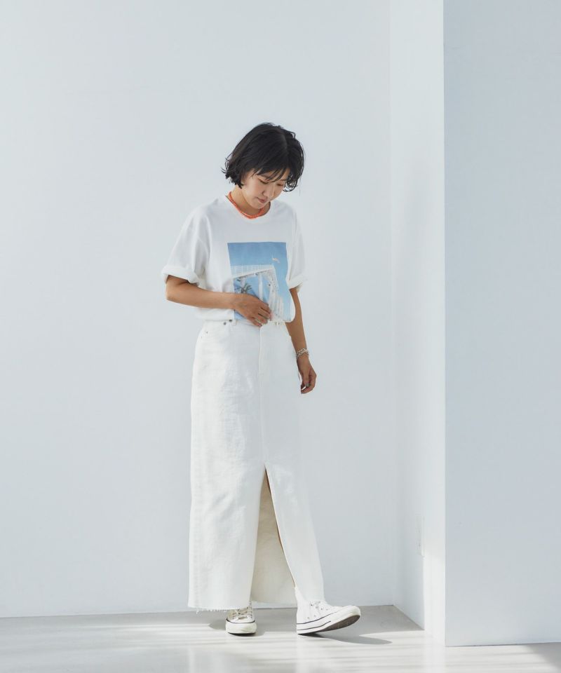 Iラインシルエットのロングスカート。腰回りがフィットしていて、裾に向かって真っすぐ落ちるすっきりとしたシルエットです。前スリットがポイントで、抜け感を演出しつつ足さばきしやすく、大人な印象を与えてくれます。腰回りがスッキリとしていて丈が長めなので縦のラインを強調し、脚長効果が期待できます。クロップド丈のトップスとも相性がよく、バランスよく合わせられます。ウエストの位置をミドルウエストで合わせてもらうとこなれ感がでて、今っぽく穿いていただけます。