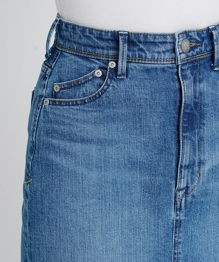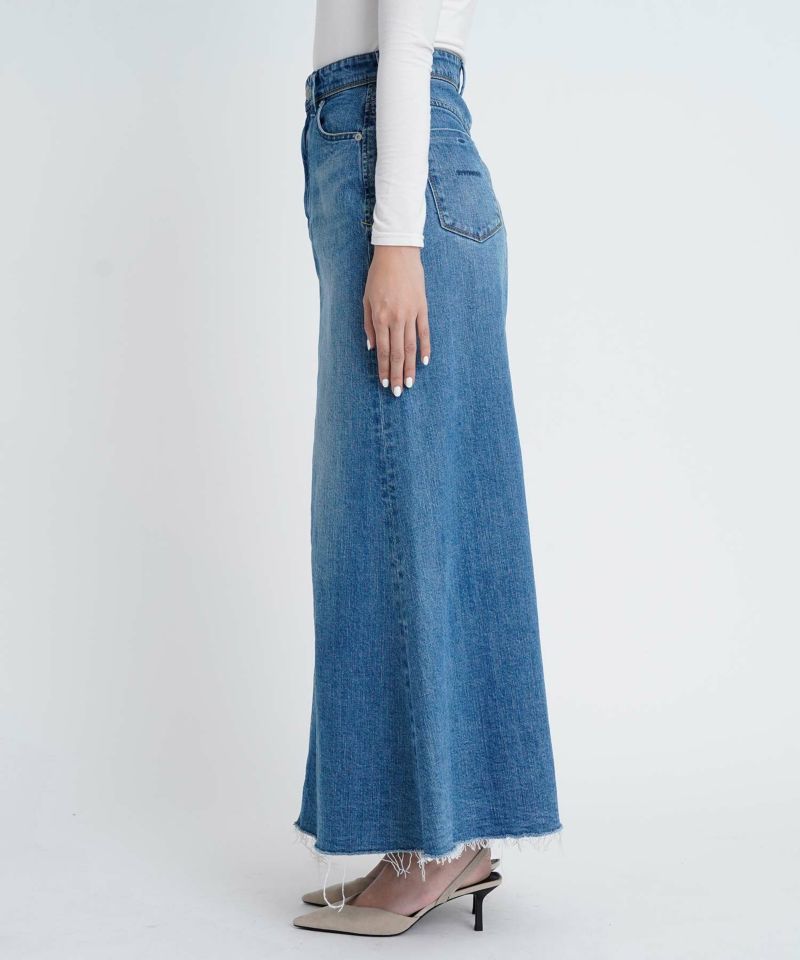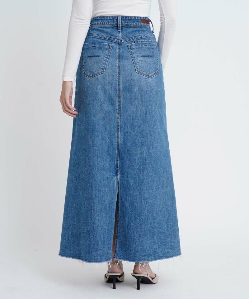 女性らしさ溢れるマキシ丈のAラインスカート。ウエストからヒップ下までフィット感があり、裾に向かってゆるやかに広がるシルエットです。フレアの広がり位置を高めに設定、なおかつ丈も長めにすることで脚長効果も狙えるスカートです。後ろの見え方にもこだわり、ポケット位置を高くしヒップが上がって見える視覚効果と、目線を上に持っていくことで更に脚を長く見せてくれます。後ろ裾にスリットを入れることで、マキシ丈ながら足さばきが良いのもオススメです。スリットを前ではなく後ろに入れていることで、座る時なども気を遣うことなく着用することができます。