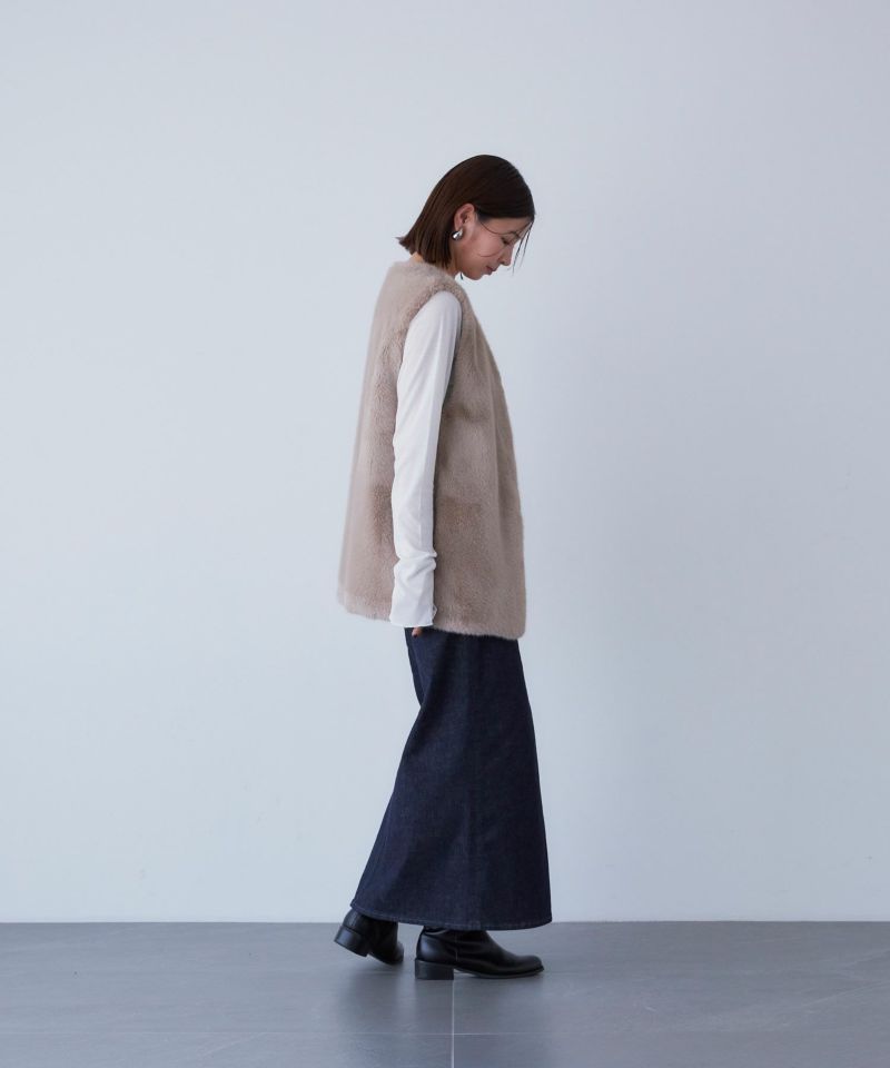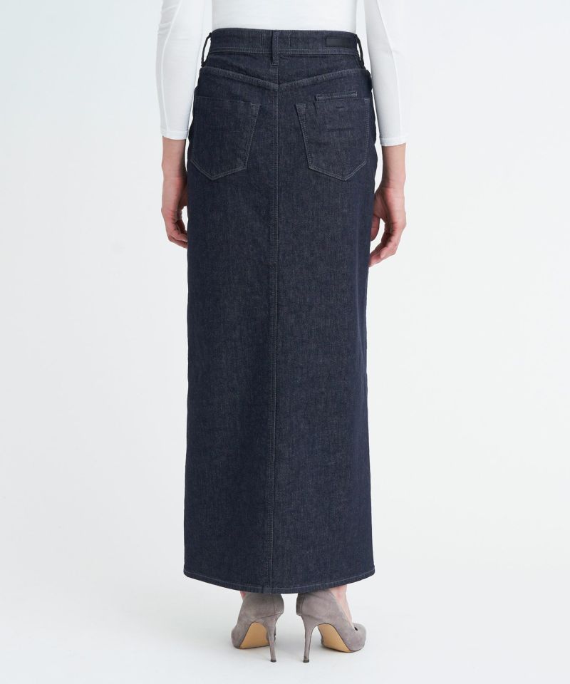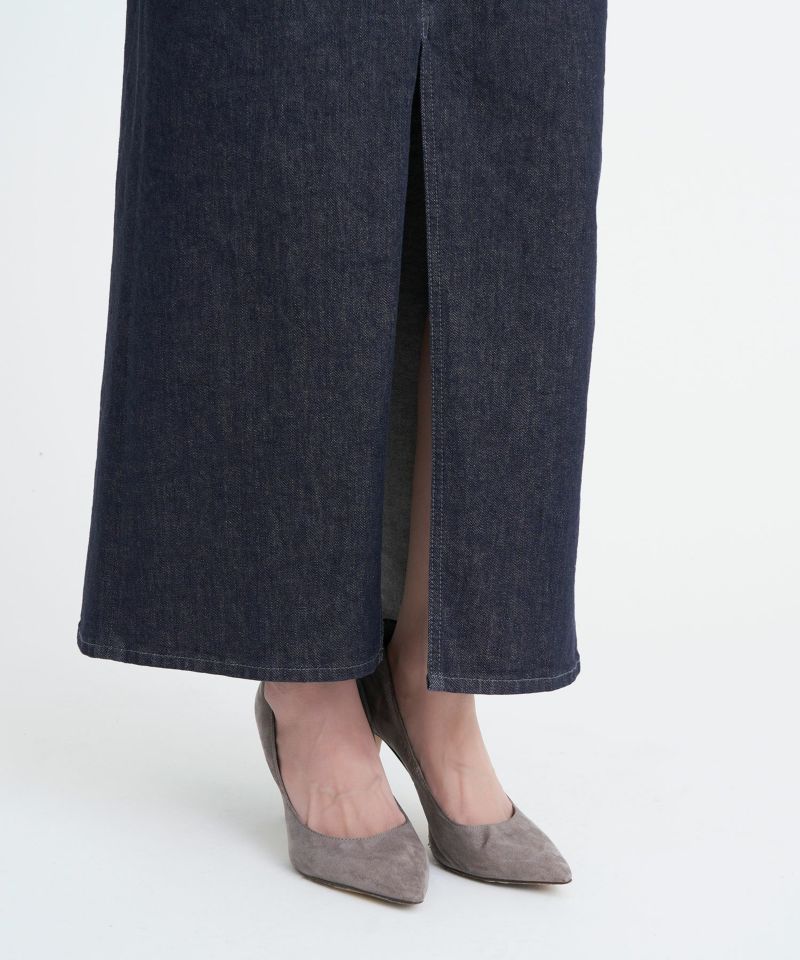 Iラインシルエットのロングスカート。腰回りがフィットしていて、裾に向かって真っすぐ落ちるすっきりとしたシルエットです。前スリットがポイントで、抜け感を演出しつつ足さばきしやすく、大人な印象を与えてくれます。腰回りがスッキリとしていて丈が長めなので縦のラインを強調し、脚長効果が期待できます。クロップド丈のトップスとも相性がよく、バランスよく合わせられます。ウエストの位置をミドルウエストで合わせてもらうとこなれ感がでて、今っぽく穿いていただけます。