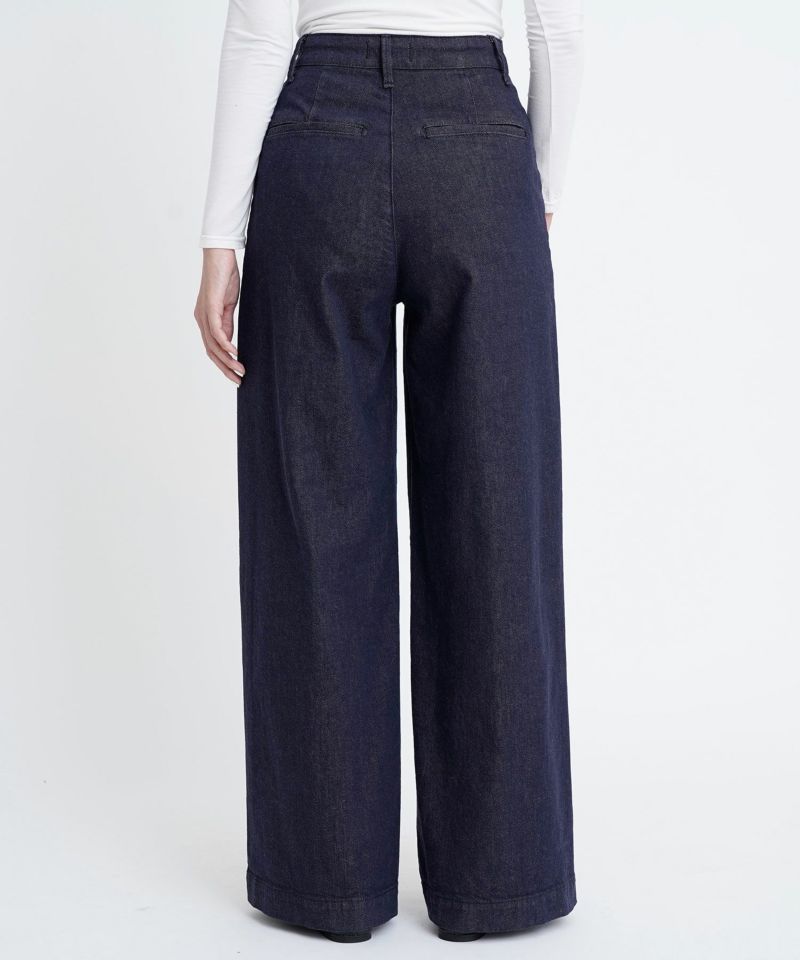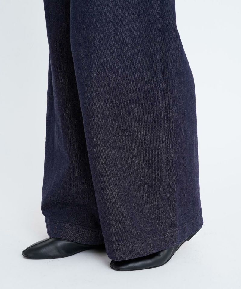 リジットデニムのような深いインディゴカラー。濃色は、カジュアル過ぎずクリーンな雰囲気が魅力的。定番として合わせやすく、キレイめなコーディネートにもマッチする品のある色です。また、色落ちしづらい染色方法で染められており、本来のインディゴデニムよりも、色移りを気にせず着用いただけます。