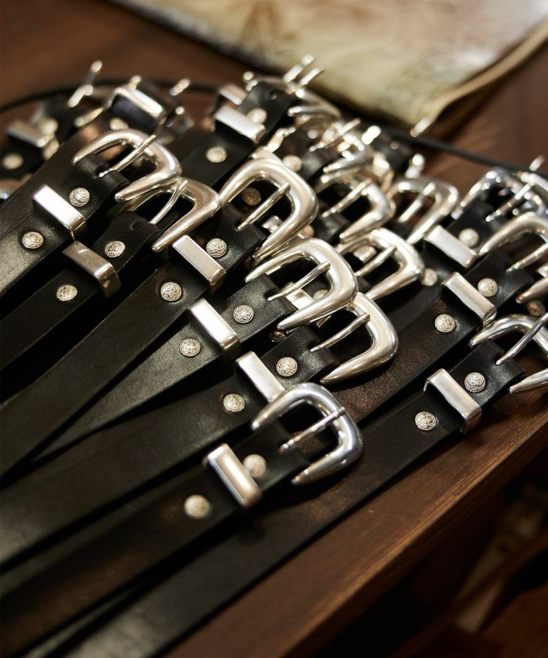 装飾性を抑えミニマルに仕上げたナローウエスタンベルト。ユニセックス仕様を意識し、全14ホールで仕上げています。裏(床)面にも樹脂塗仕様を採用し、垂らしても使える様に両サイドの表情作りにもこだわりと尽しています。