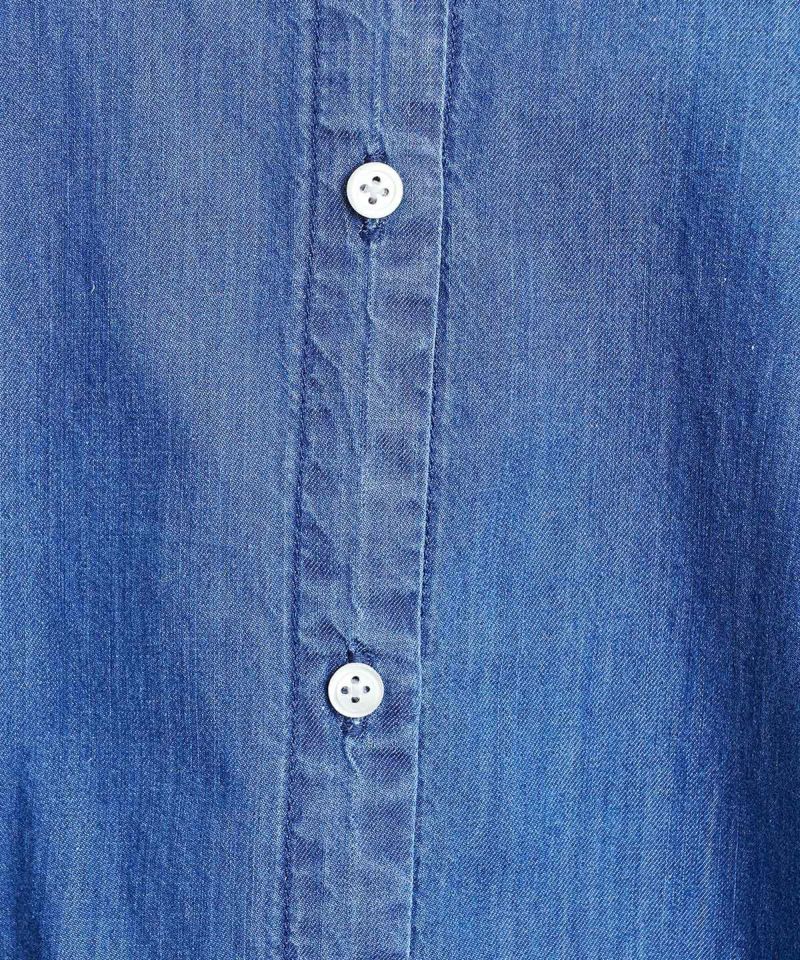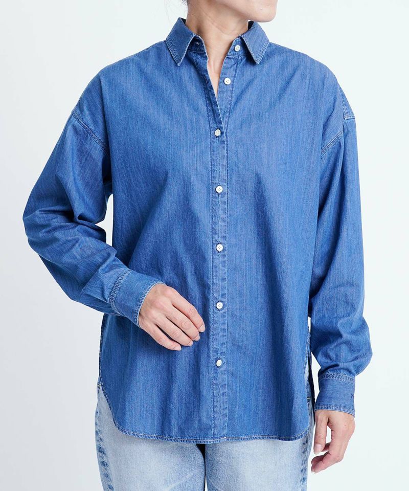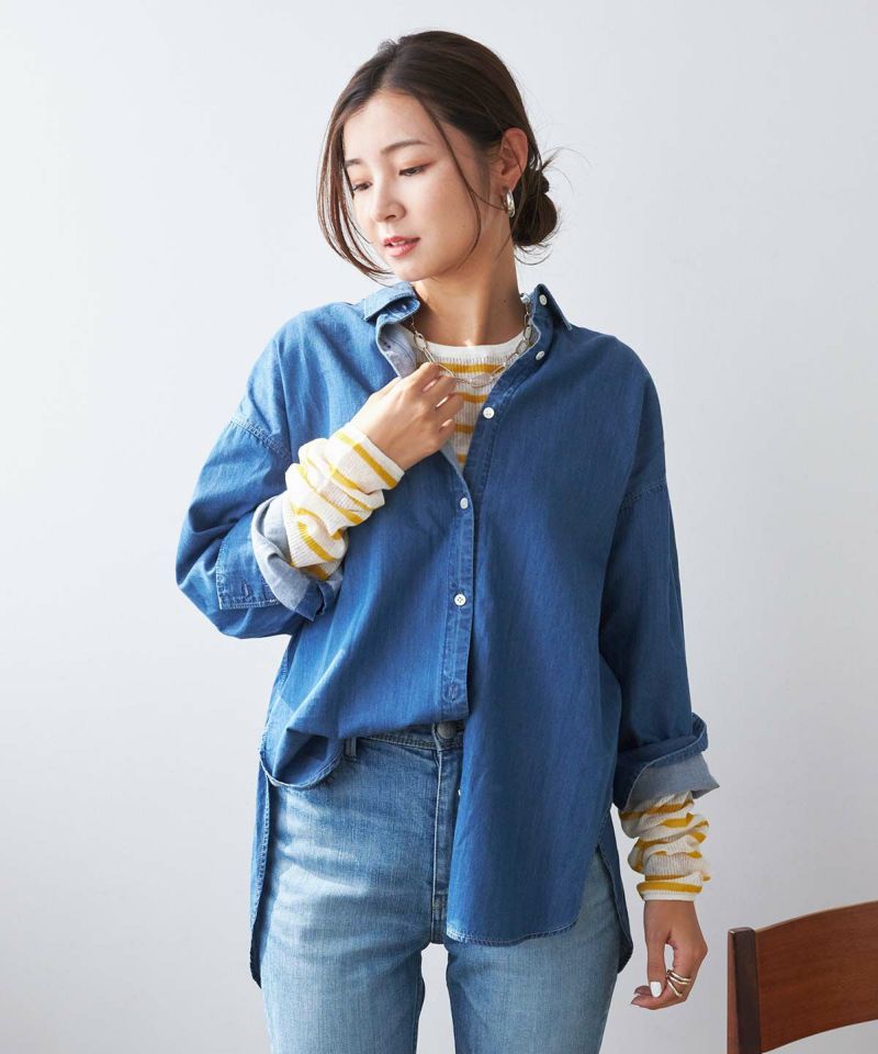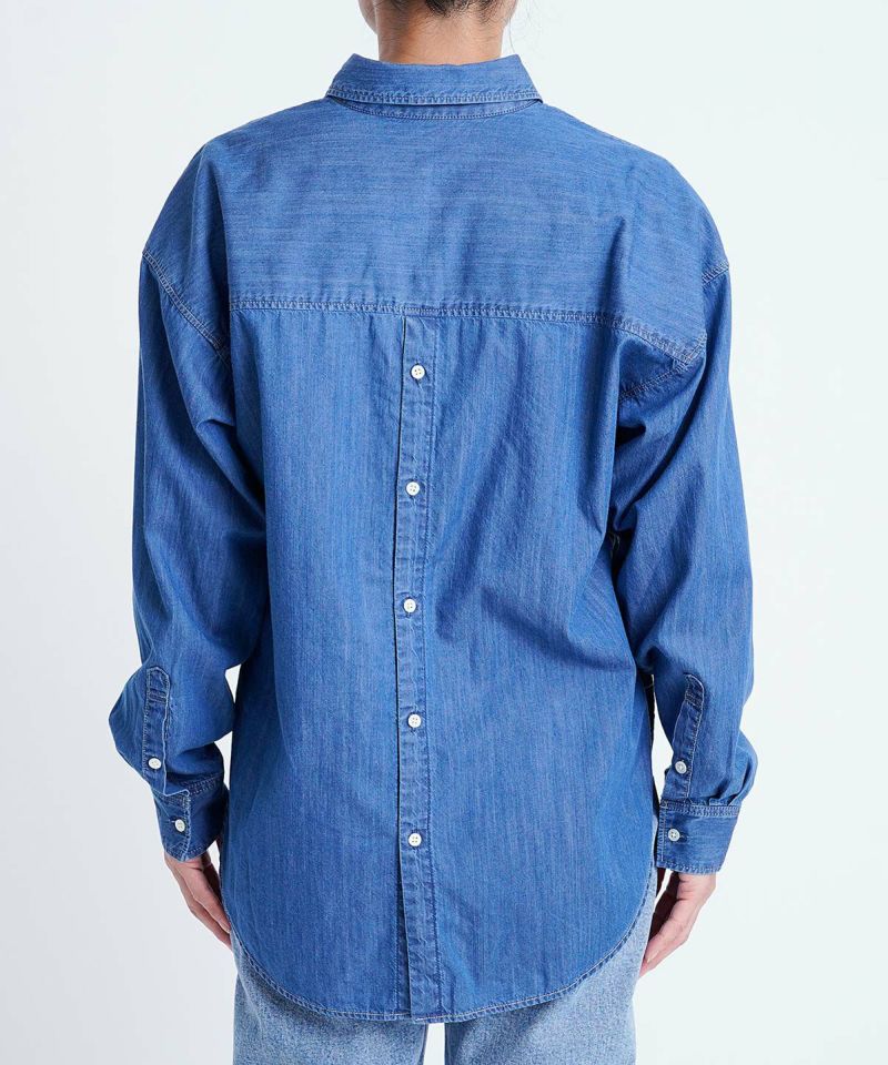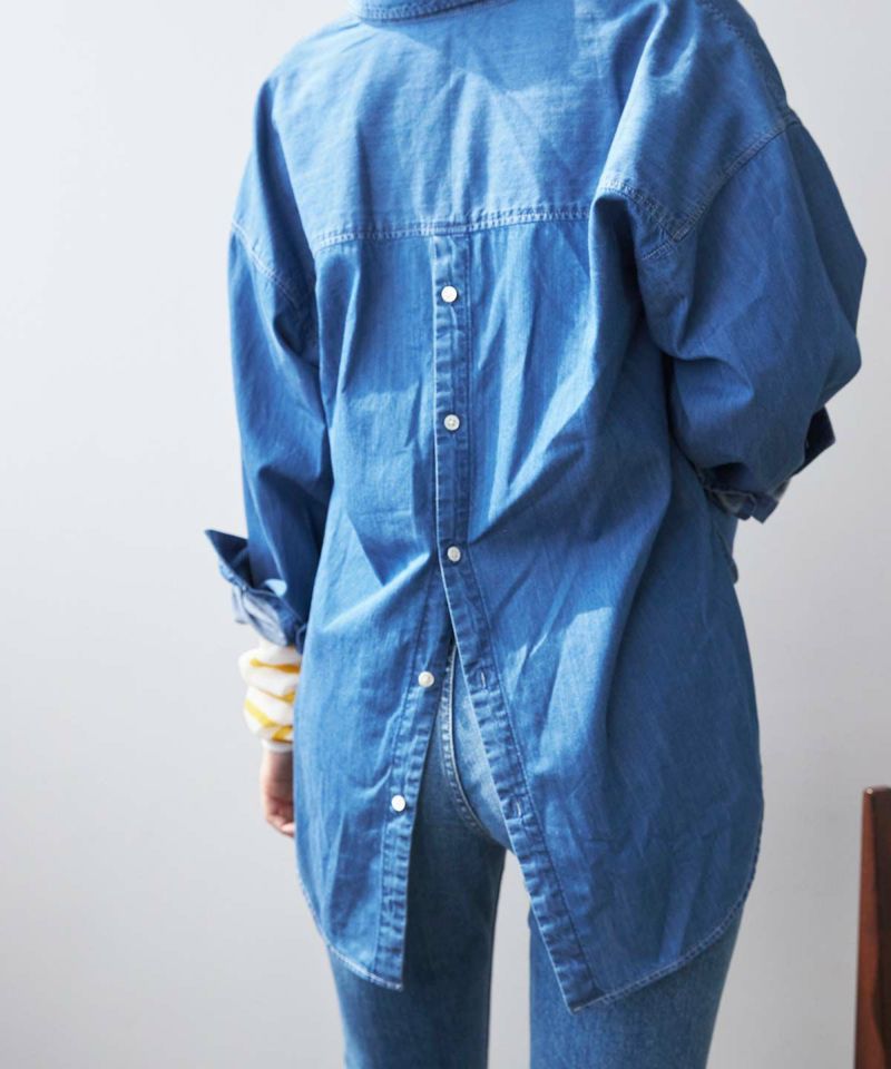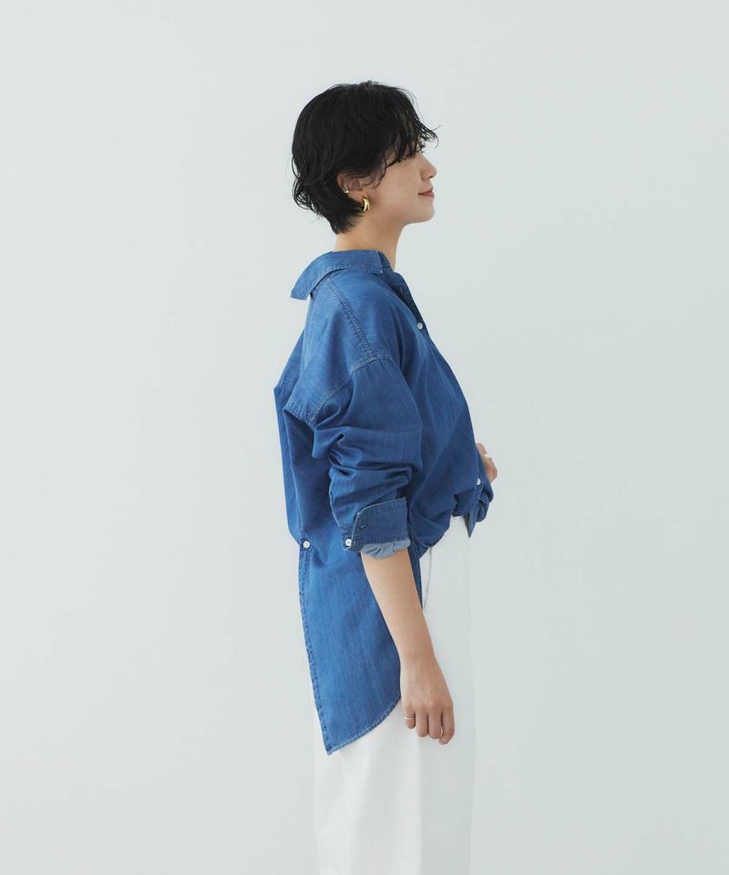 シンプルながらデザイン性のあるバックボタンのデニムシャツです。シルエットは、すっきりとしたボクシーシルエット。キチンと見えするシャツですが、着方でイメージを変えられる万能シャツです。ポイントは後ろにボタンがついていて、後ボタンをあけて着るとスリットのように見せられます。前ボタンをしっかり閉めてボトムスにインするとクラシカルムードに。第2ボタンまであけて衿をぬき、前だけインするとラフなムードにもなります。ミドルウエストのパンツには裾を出して、ハイウエストのパンツには前だけインするとコーディネートのバランスがとりやすいです。