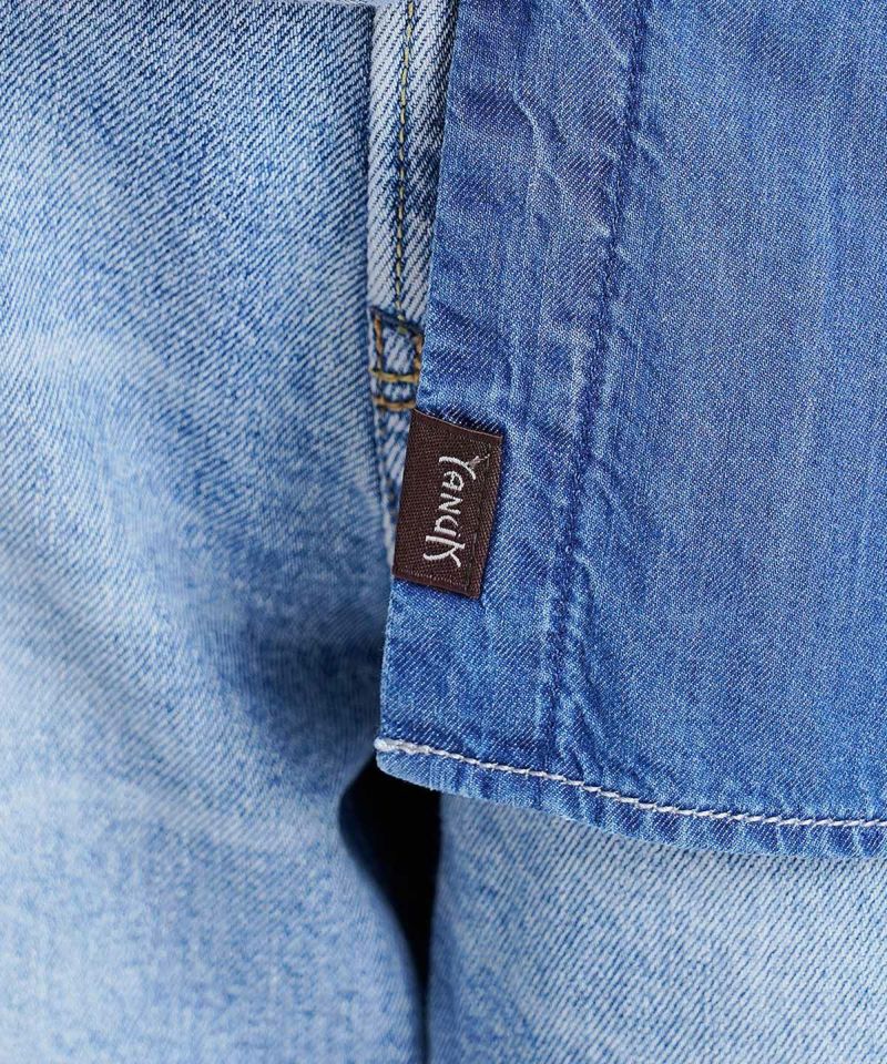 シンプルながらデザイン性のあるバックボタンのデニムシャツです。シルエットは、すっきりとしたボクシーシルエット。キチンと見えするシャツですが、着方でイメージを変えられる万能シャツです。ポイントは後ろにボタンがついていて、後ボタンをあけて着るとスリットのように見せられます。前ボタンをしっかり閉めてボトムスにインするとクラシカルムードに。第2ボタンまであけて衿をぬき、前だけインするとラフなムードにもなります。ミドルウエストのパンツには裾を出して、ハイウエストのパンツには前だけインするとコーディネートのバランスがとりやすいです。