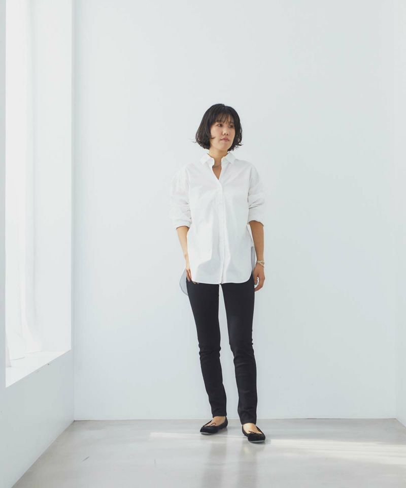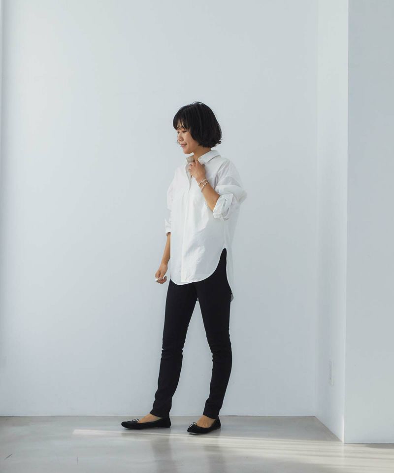 シンプルながらデザイン性のあるバックボタンのデニムシャツです。シルエットは、すっきりとしたボクシーシルエット。キチンと見えするシャツですが、着方でイメージを変えられる万能シャツです。ポイントは後ろにボタンがついていて、後ボタンをあけて着るとスリットのように見せられます。前ボタンをしっかり閉めてボトムスにインするとクラシカルムードに。第2ボタンまであけて衿をぬき、前だけインするとラフなムードにもなります。ミドルウエストのパンツには裾を出して、ハイウエストのパンツには前だけインするとコーディネートのバランスがとりやすいです。