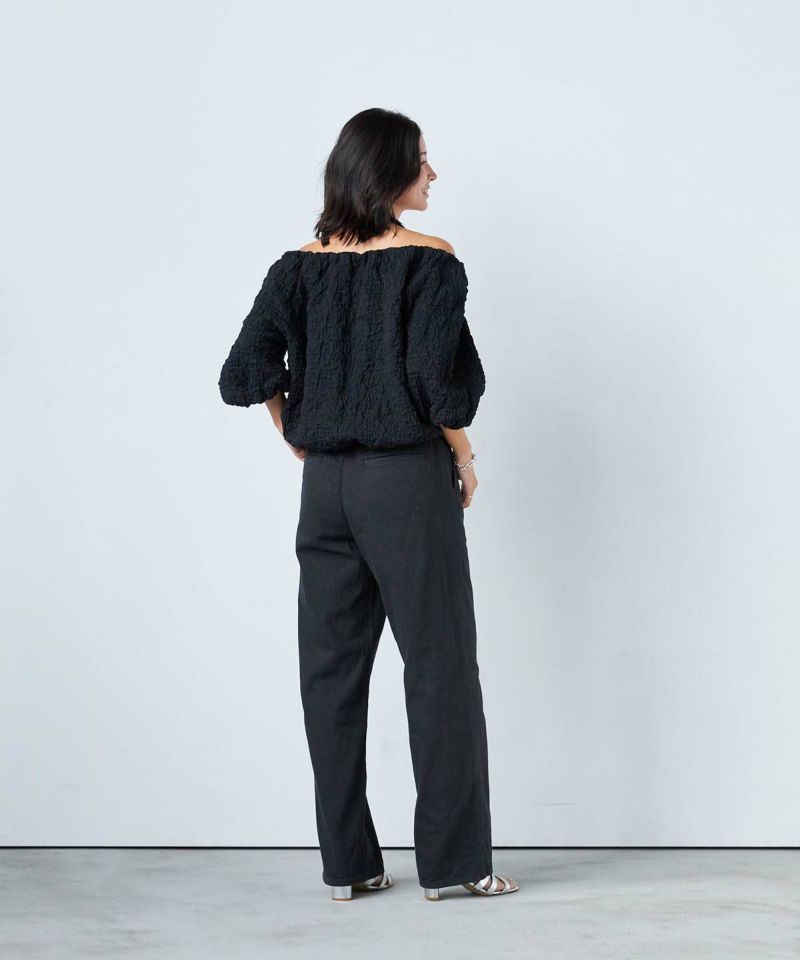 素材特有のムラ感とシボ感をいかしたライトグレーとブラック。麻の節と相まって立体感があり、単調にならない程よいカジュアルさと女性らしさを兼ね備えたカラーです。