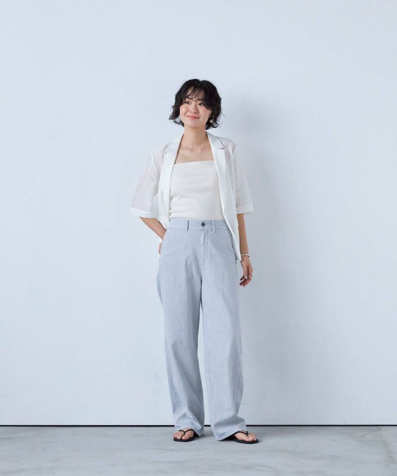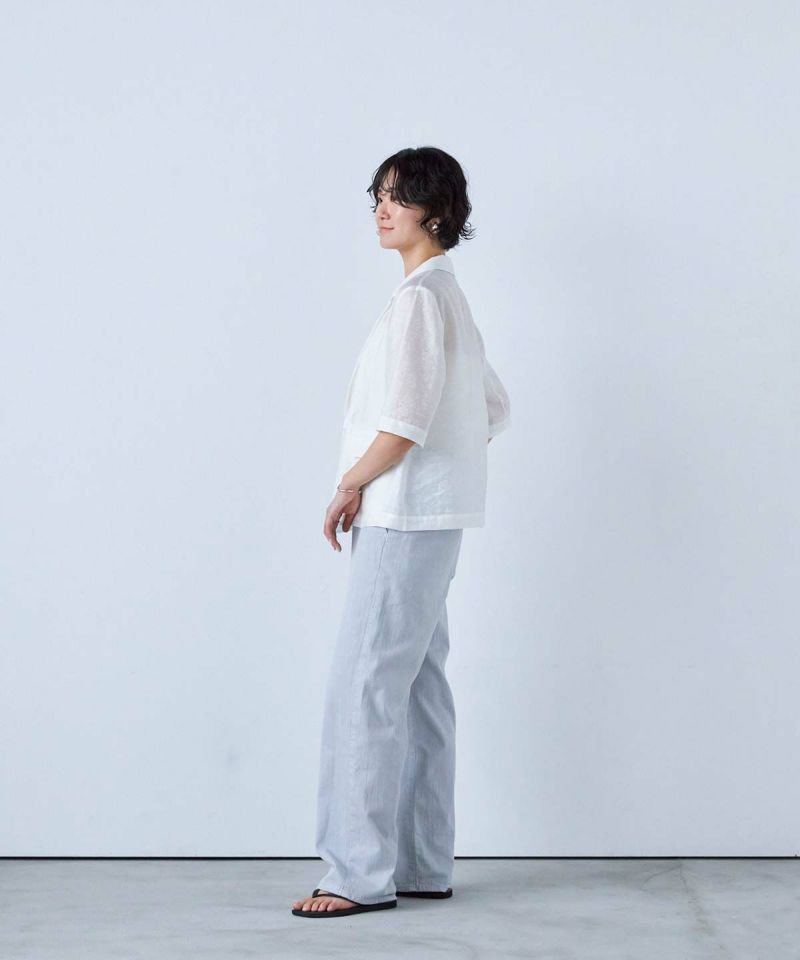YANUKの夏の定番素材である麻混の素材は軽くて柔らかで、驚くほど軽いのが特徴です。麻が入っていることにより、独特の「しゃり感」と「通気性」が生まれ清涼感を与えます。でも麻特有の「チクチク感」「ゴワゴワ感」はありません。麻と一緒に柔らかいレーヨンを入れ、肌あたりをなめらかにしているからです。ストレッチ入りなのでとてもはきやすく、麻なのに「シワになりにくい」優秀な生地です。