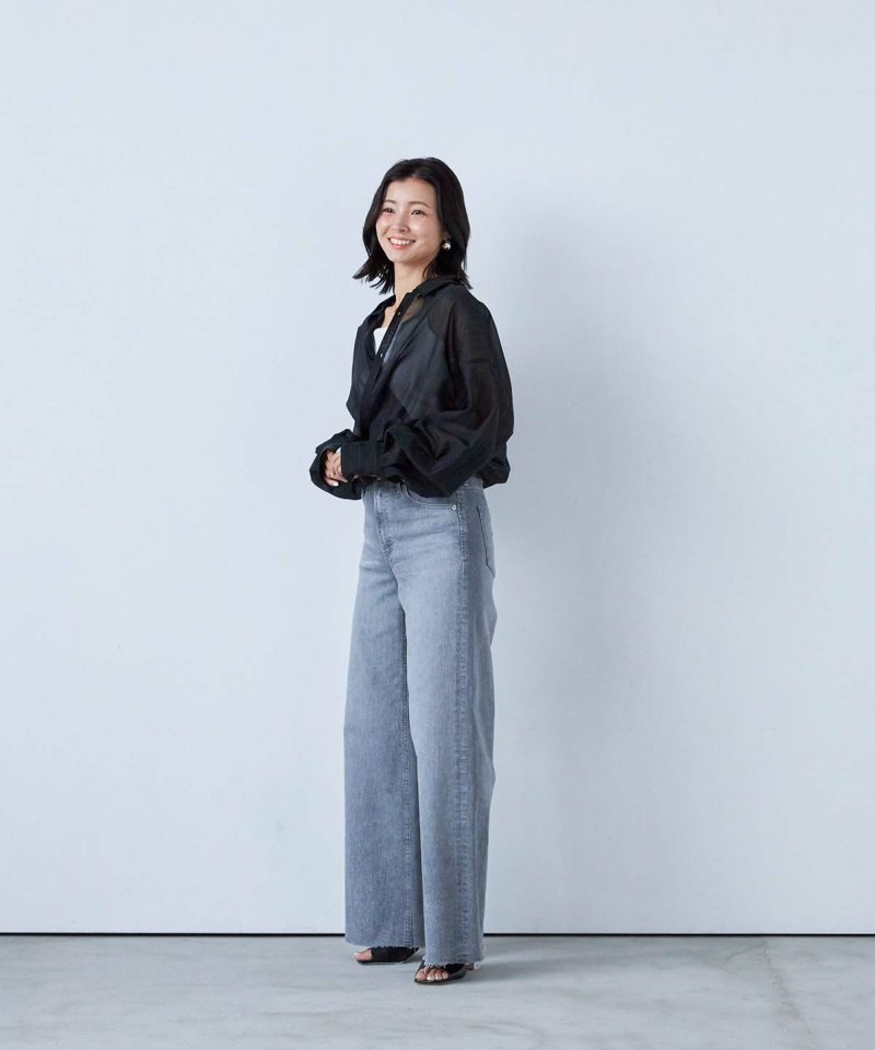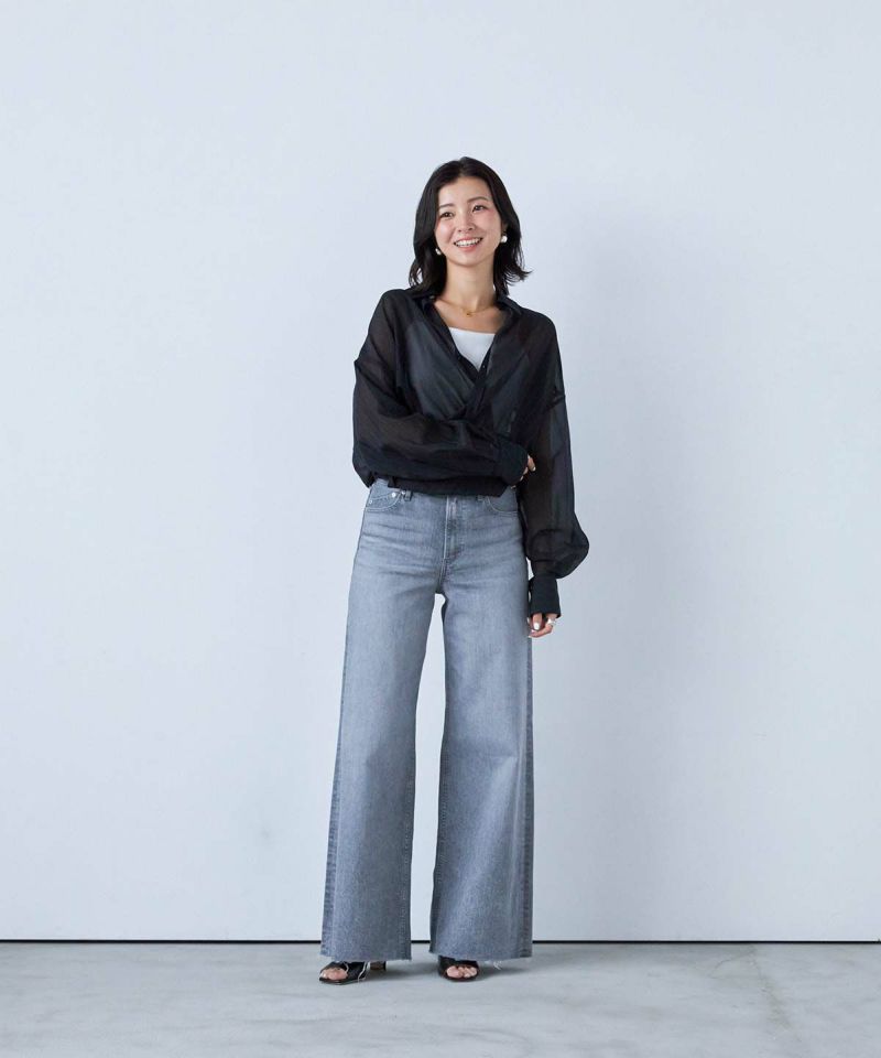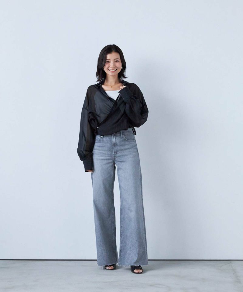 美脚見えとこなれ感を兼ね備えたフレアシルエットの”クレア”です。もも周りをぴったりさせすぎず、身体のラインをひろいすぎない絶妙なゆとりをもたせており、程よい抜け感と快適な穿き心地となっています。また、ひざの絞り位置を少し高めにした足が長く見えるパターンメイキングをしており、脚全体を長く美しく見せてくれ、自然にスタイルアップが叶います。腰回りは、もたつきのないすっきりとしたミッドライズで、抜け感がありながら女性らしさも兼ね備えています。ミッドライズでおなかのラインも目立ちにくく、トップスインもしやすい、着回し力の高いシルエットです。