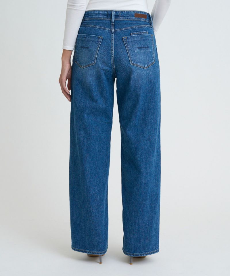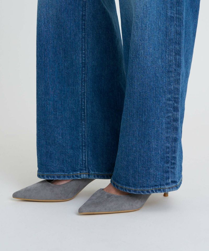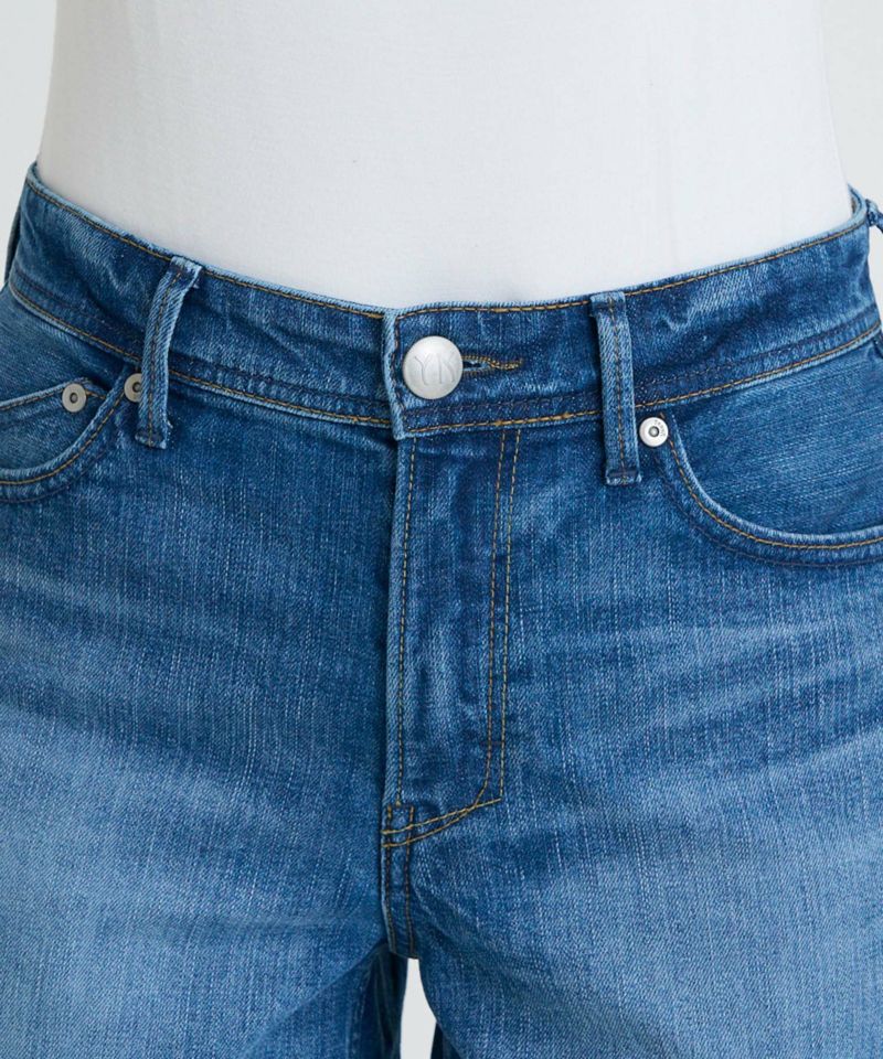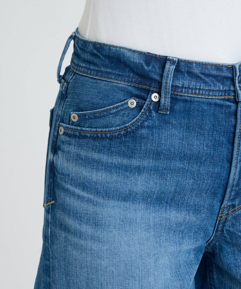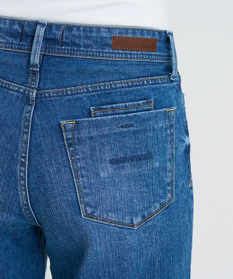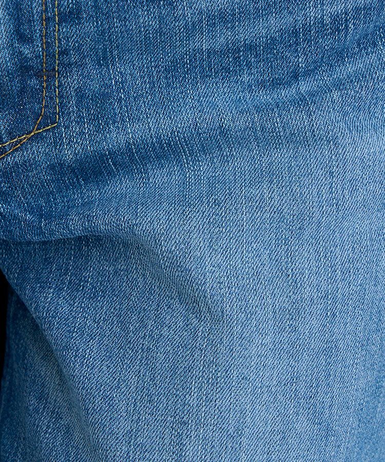 通年穿きやすい中間色ブルー。古着のようなUSED加工を再現しながら、少しかすみがかったような表情感に仕上げることで、様々なコーディネートに合わせやすいカラーになっています。腿にハイライトのスリを入れることで、本格見えながら、脚が細く見えるような加工感にもこだわりました。